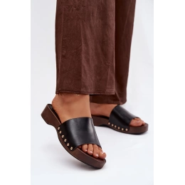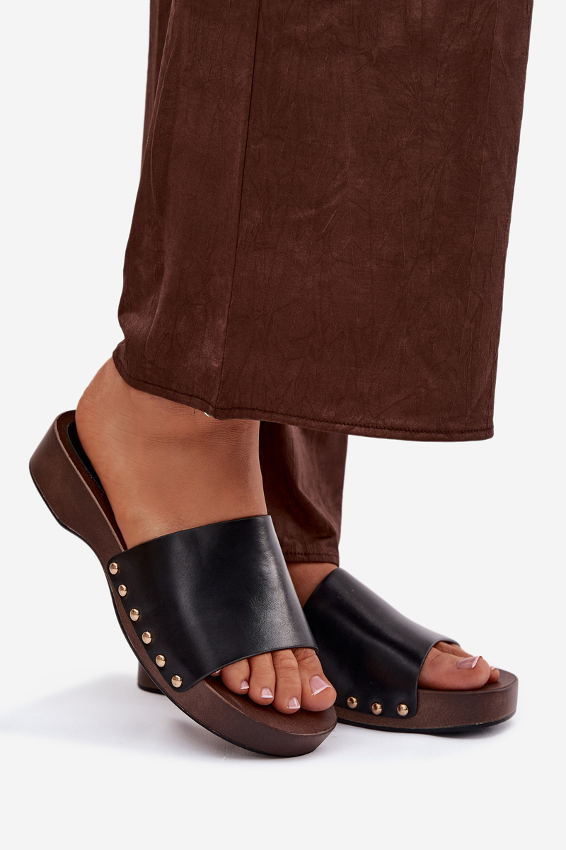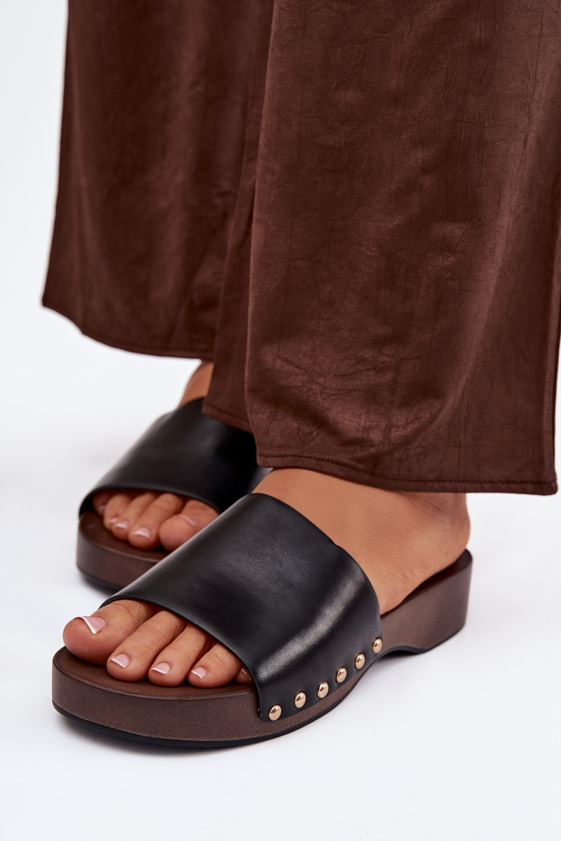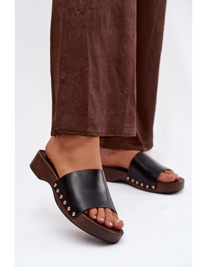 Černé pantofle se zlatými cvočky skvěle doplní jak jednoduchý, tak elegantnější letní outfit a dodají mu výrazný akcent.