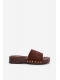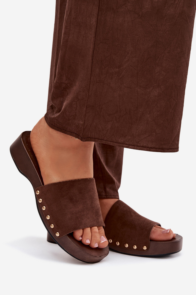 Čokoládové pantofle se zlatými cvočky krásně doplní outfit v béžových, krémových nebo bílých tónech a dodají mu elegantní akcent.