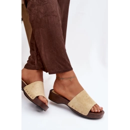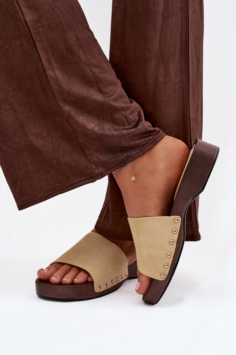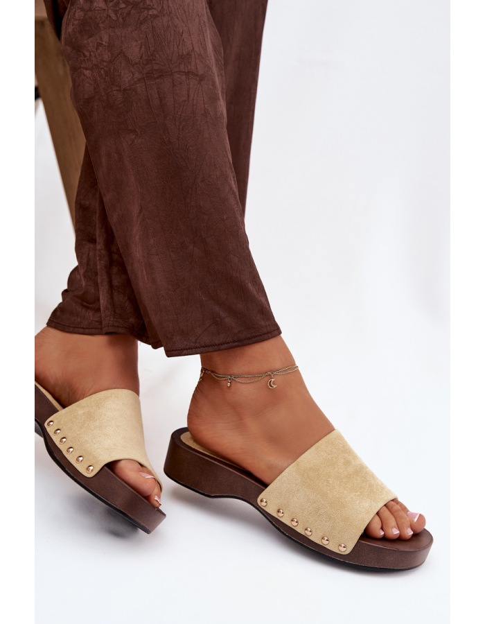 Žluté pantofle se zlatými cvočky krásně vyniknou v kombinaci s jednoduchým outfitem v bílých, béžových nebo džínových tónech.