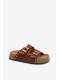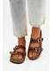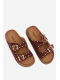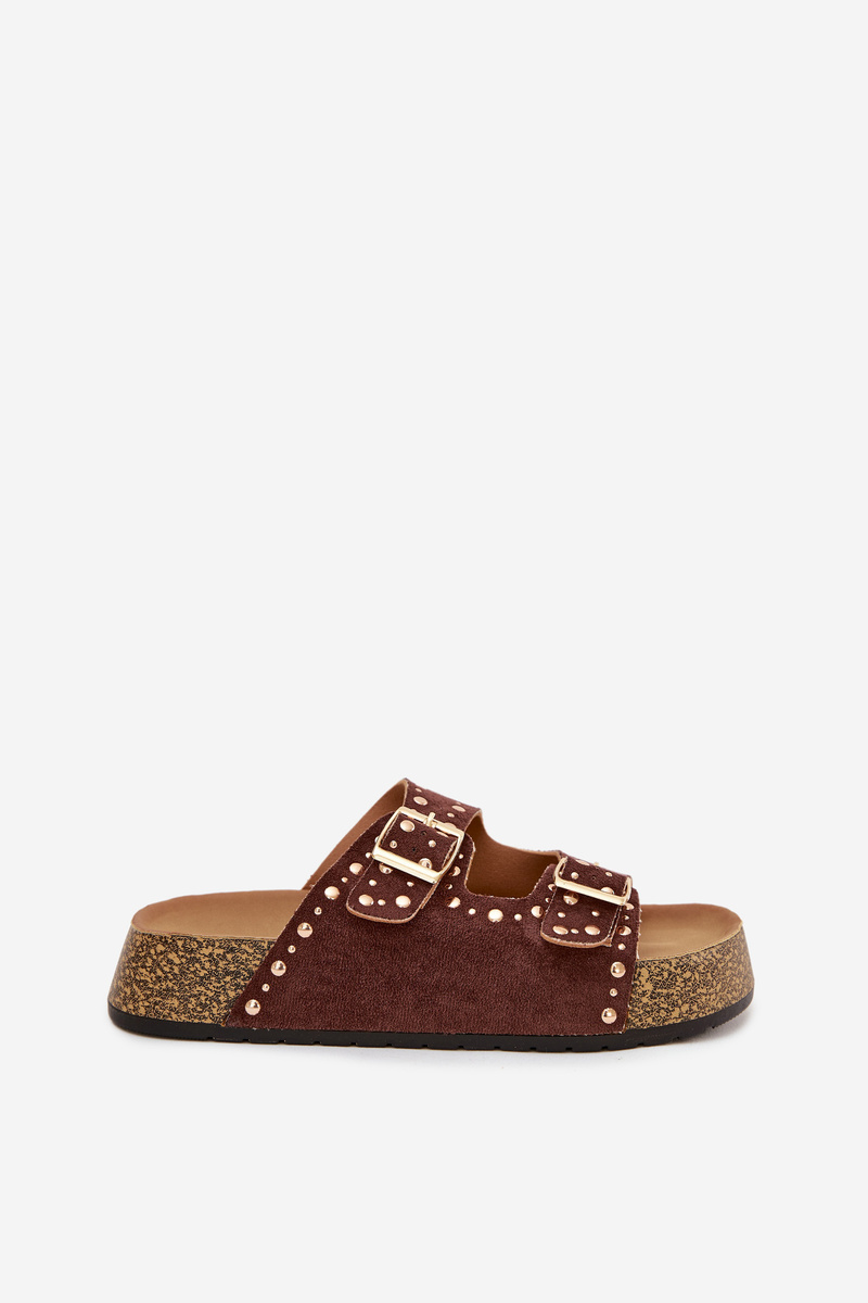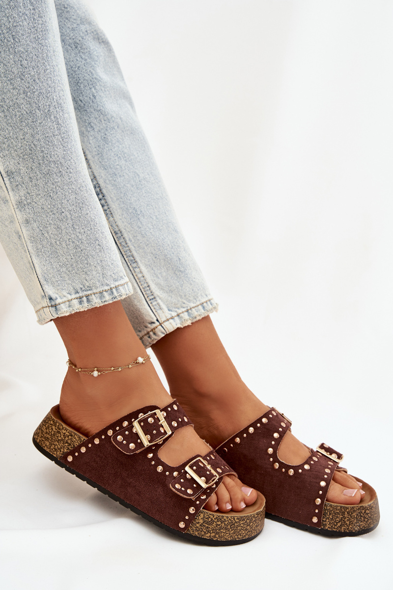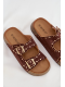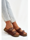 Dámské pantofle Tervina v hnědém provedení zaujmou kombinací zlatých přezek a dekorativních cvočků, které dodávají obuvi výrazný a elegantní charakter. Pohodlný střih zajišťuje komfort při každodenním nošení, zatímco hnědá barva v přírodním tónu působí nadčasově a snadno se kombinuje s letními i městskými outfity.