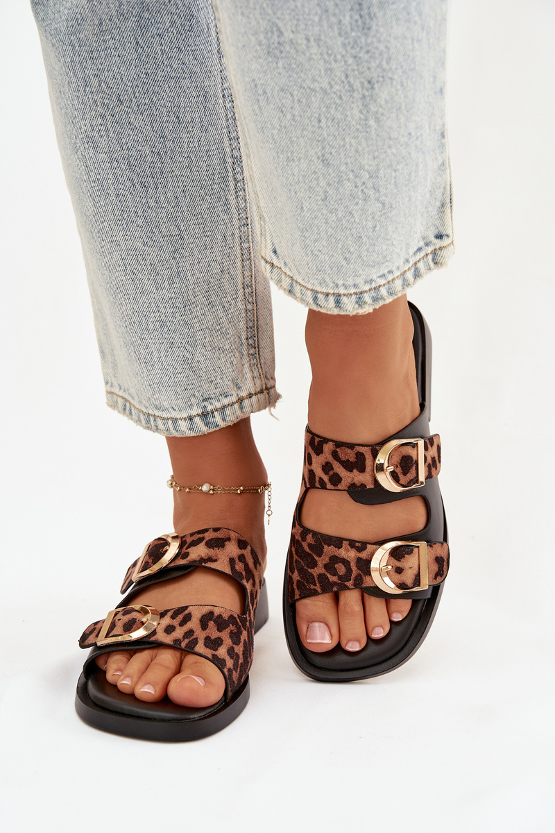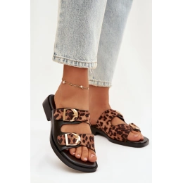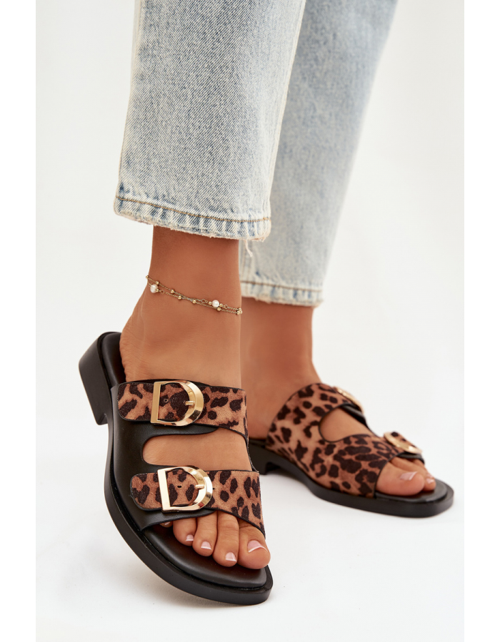 Dámské Danelle pantofle v atraktivním černo-hnědém provedení s panteřím vzorem kombinují pohodlí s módním a výrazným designem. Stylové zlaté přezky dodávají botám elegantní akcent, zatímco panteří vzor přináší trendy a originální vzhled. Plochá podešev zajišťuje stabilní a komfortní došlap, ideální pro každodenní nošení — od města až po volnočasové aktivity.