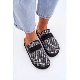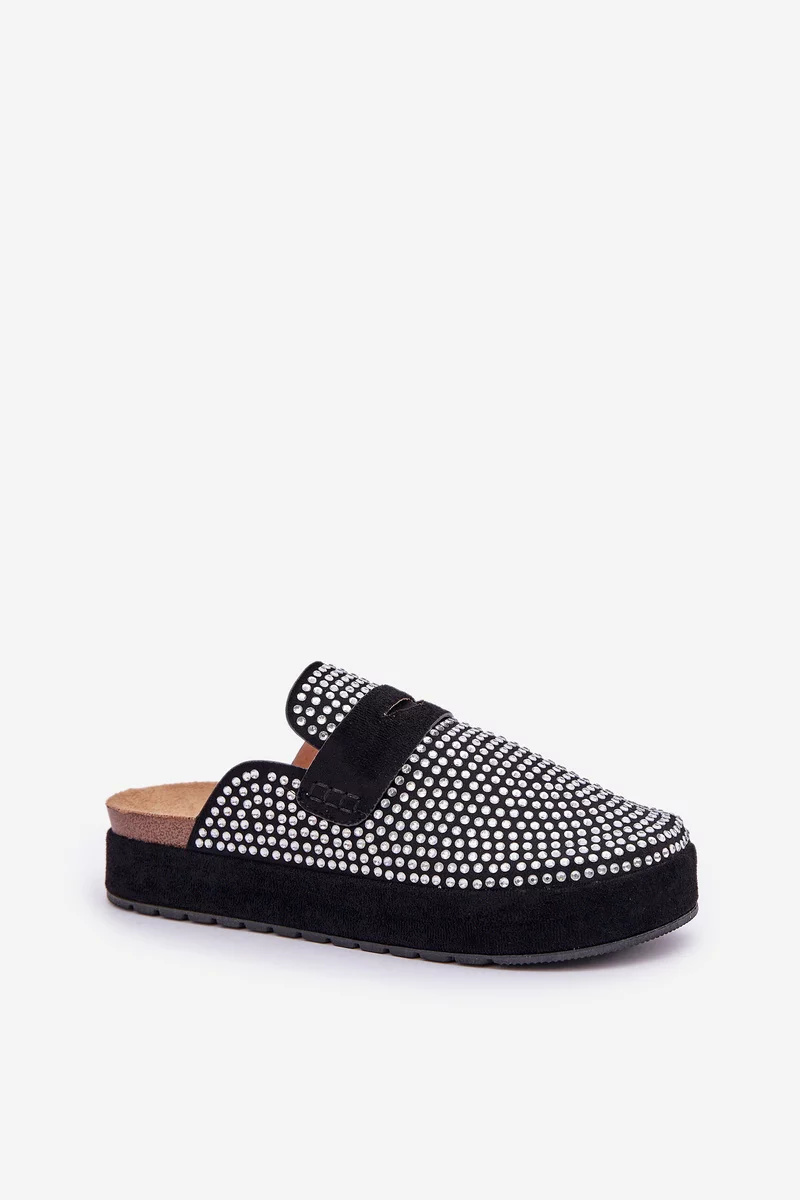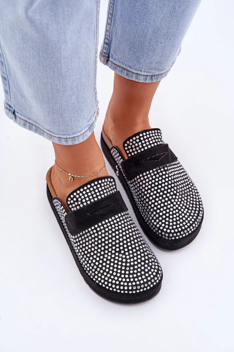 Černé pantofle se zirkony krásně vyniknou v kombinaci s jednoduchým outfitem, kde se stanou hlavním elegantním akcentem.