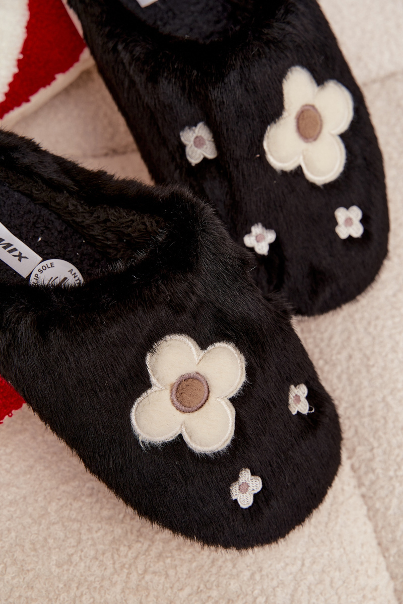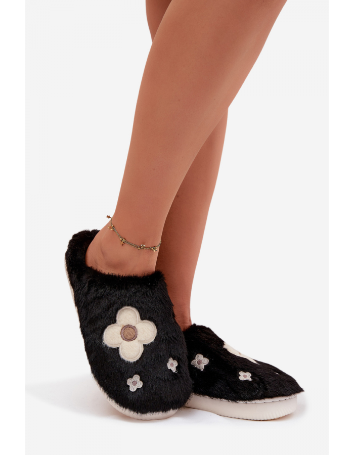 Černé dámské papuče Selinne zaujmou hebkým kožíškem a roztomilými květinkami, které dodávají obuvi hravý a ženský vzhled. Měkká vnitřní výstelka i lehká podrážka zajišťují maximální pohodlí při domácím nošení.