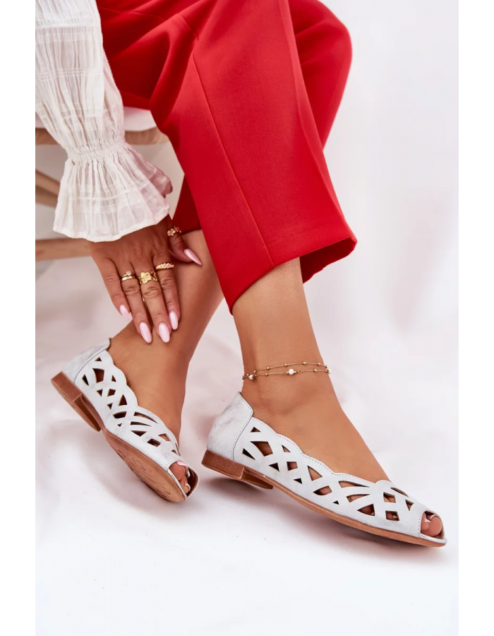 Stylové stříbrné baleríny Calgis s otevřenou špičkou a perforovaným designem kombinují pohodlí s moderním a elegantním vzhledem. Plochá podrážka zajišťuje komfort po celý den, zatímco stříbrný odstín dodává obuvi jemný lesk a sofistikovaný charakter. Ideální volba pro letní dny a stylové outfity.