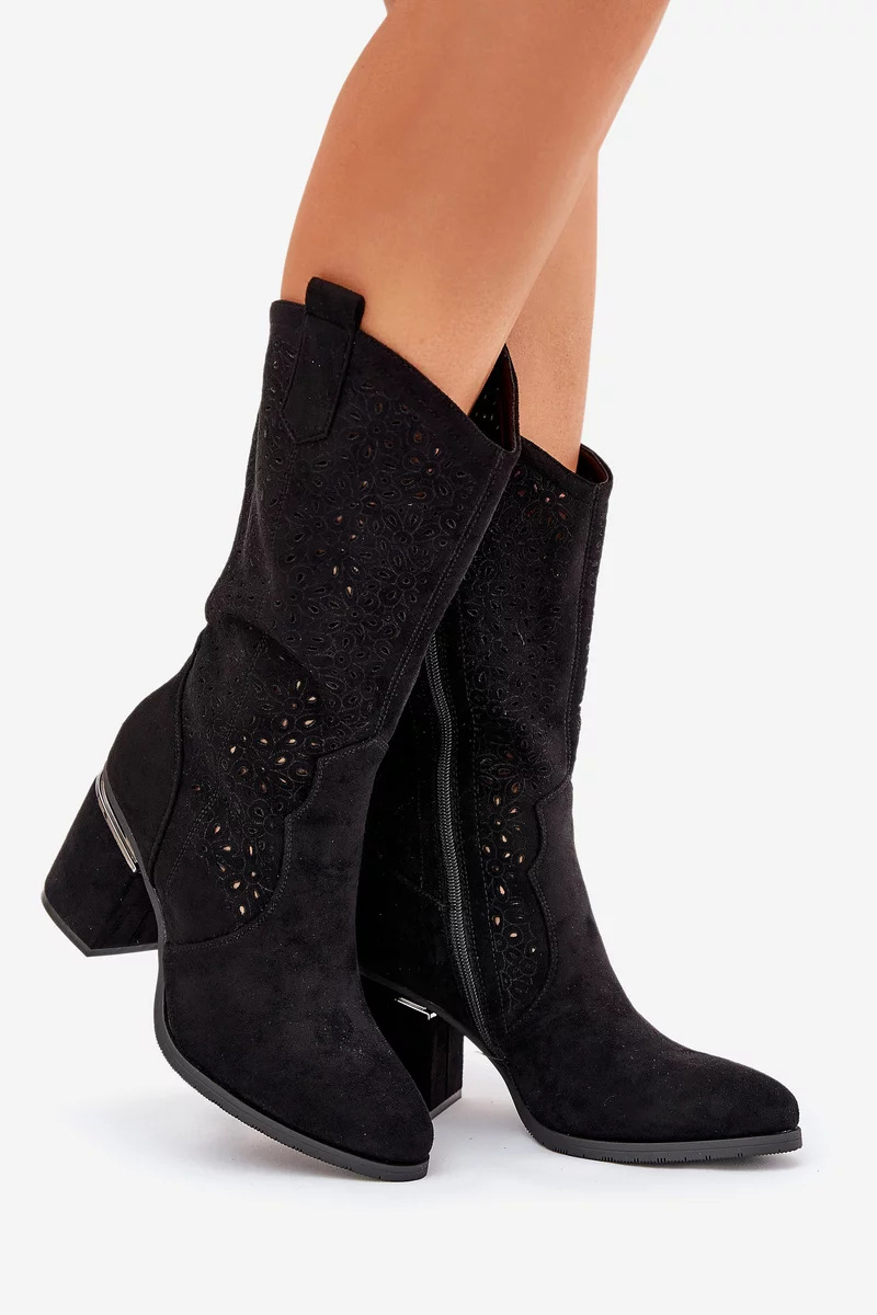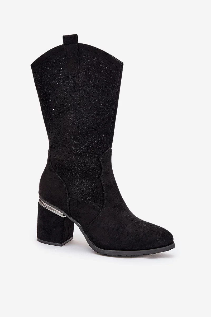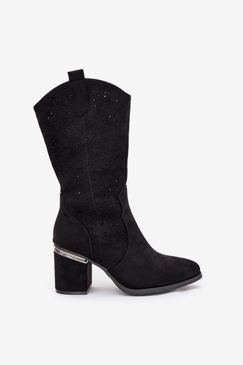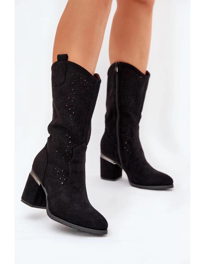 Stylové dámské kozačky S.Barski v černém provedení sahají do poloviny lýtka a kombinují pohodlný sloupkový podpatek s módním perforovaným designem. Kovbojský střih dodává botám originální a trendy vzhled, zatímco stabilní podpatek zajišťuje komfortní chůzi. Hladký eko kožený materiál je odolný a nadčasový.