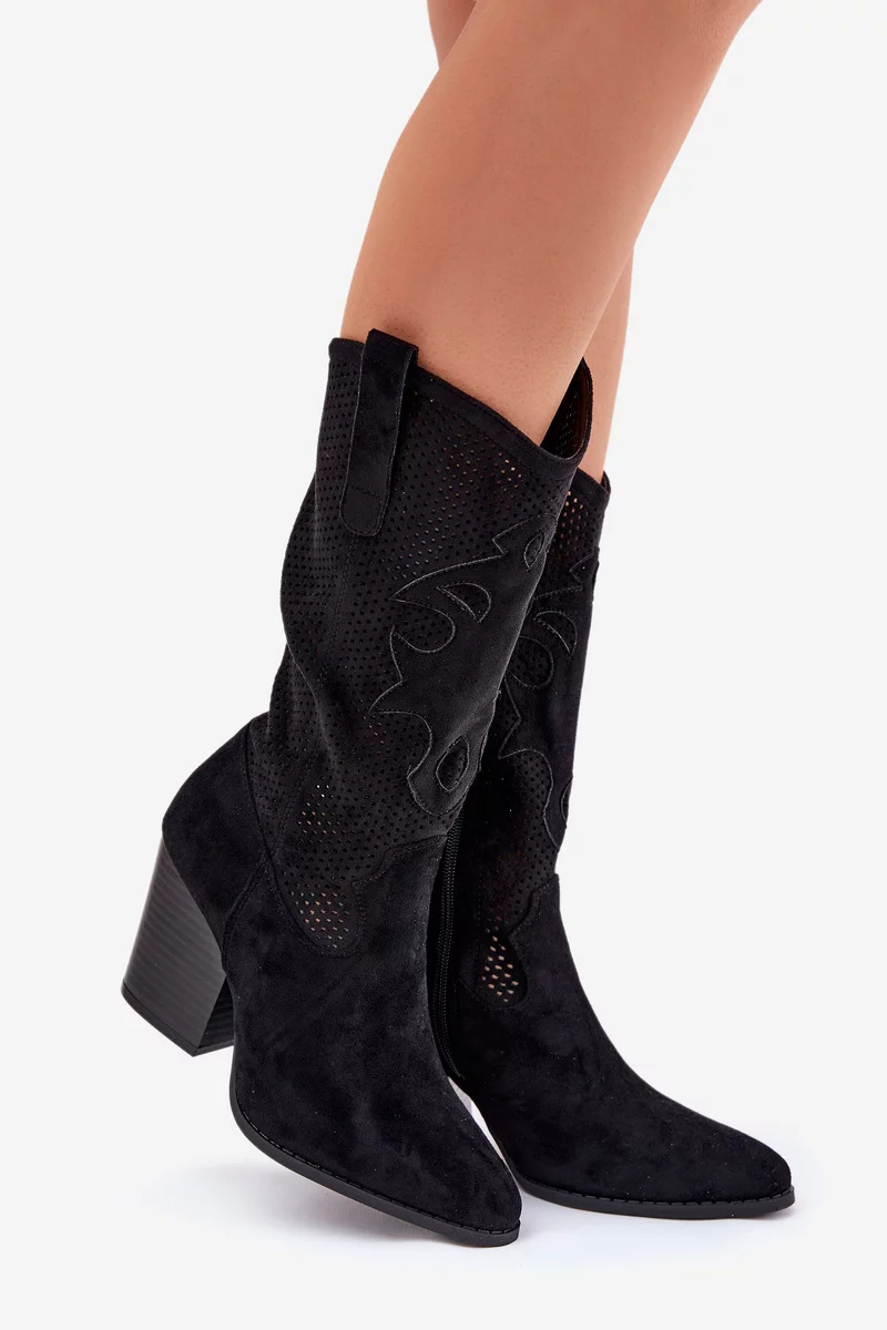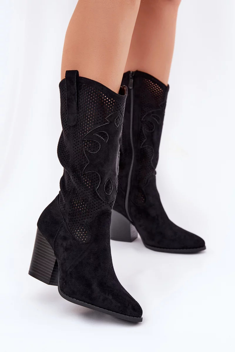 Stylové dámské kozačky S.Barski v černém provedení kombinují moderní perforovaný design s komfortním sloupkovým podpatkem. Kovbojský střih a elegantní linie dodávají botám originální a trendy vzhled, zatímco stabilní podpatek zajišťuje pohodlnou chůzi. Hladký eko kožený materiál je odolný a nadčasový.
