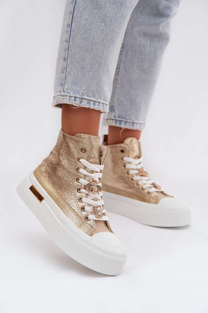 Dámské tenisky Gracella ve zlatém provedení zaujmou originálním designem doplněným o dekorativní připínky, které dodávají obuvi hravý a výrazný charakter. Platformová podešev zajišťuje pohodlný a stabilní došlap, zatímco klasický střih tenisek je ideální pro každodenní nošení. Zlatá barva působí luxusně a stává se výrazným módním akcentem.
