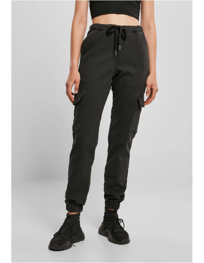 Tyto sportovní a funkční dámské cargo kalhoty, vybavené dvěma našitým cargo kapsami na stehnech, elastickými manžetami a pohodlným elastickým pasem se stahovací šňůrkou, působí nádherně harmonicky. Dokonalý střih v pase zajišťuje optimální pohodlí při nošení. Pod ním je slepý módní zip. Dámské cargo kalhoty mají také dvě boční kapsy a jsou volného střihu. Je vyrobena z univerzálního pleteného denimu.