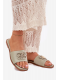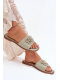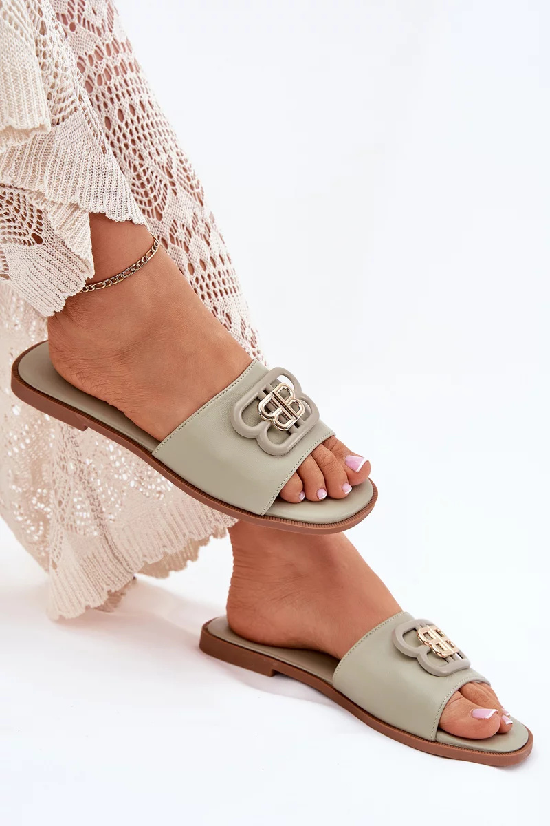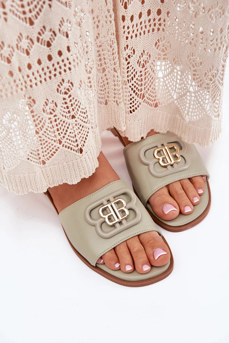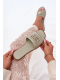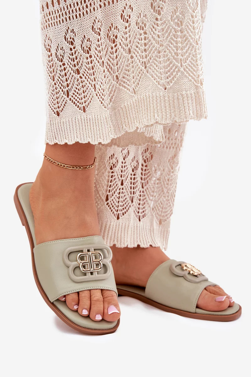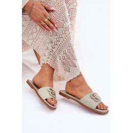 Zelené pantofle s ozdobným detailem krásně vyniknou v kombinaci s neutrálním outfitem v bílé, béžové nebo krémové barvě.