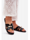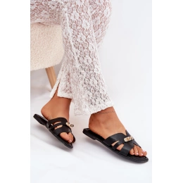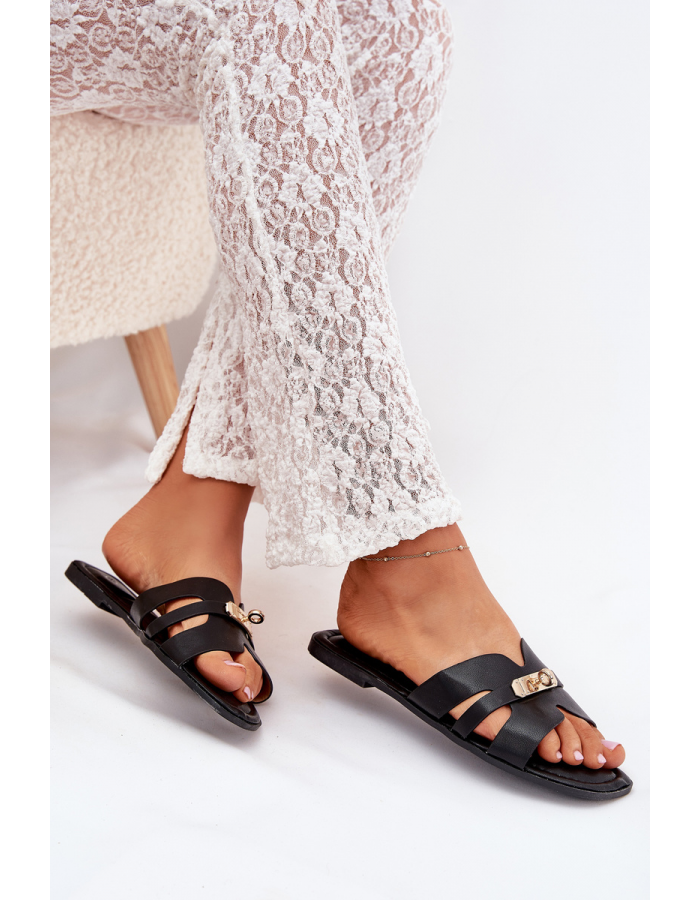 Černé pantofle se zlatým detailem krásně doplní neutrální outfity – zkombinujte je třeba s bílými šaty nebo denimovými kraťasy pro elegantní letní look.