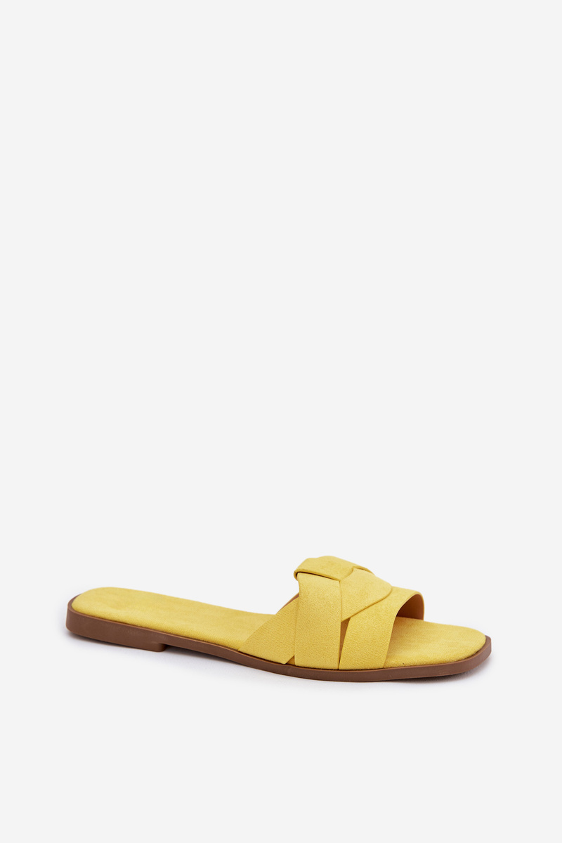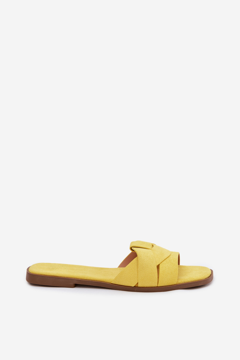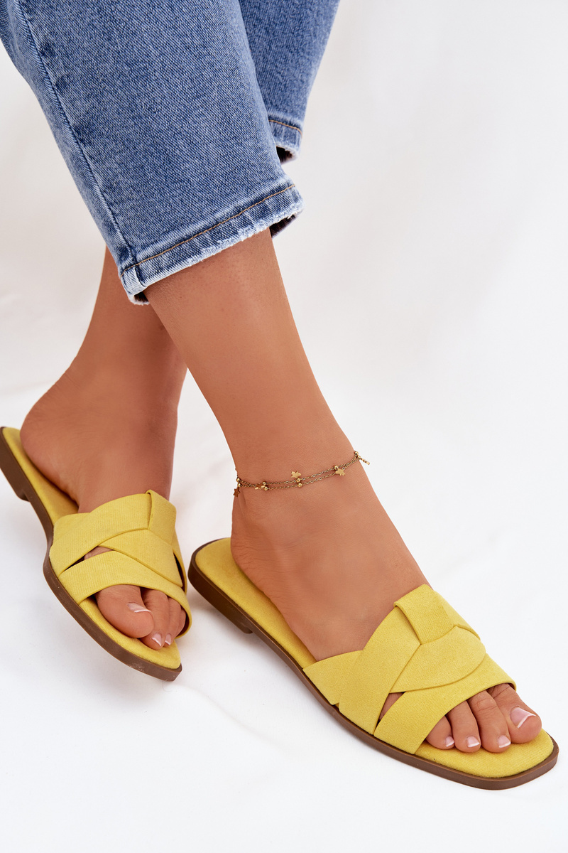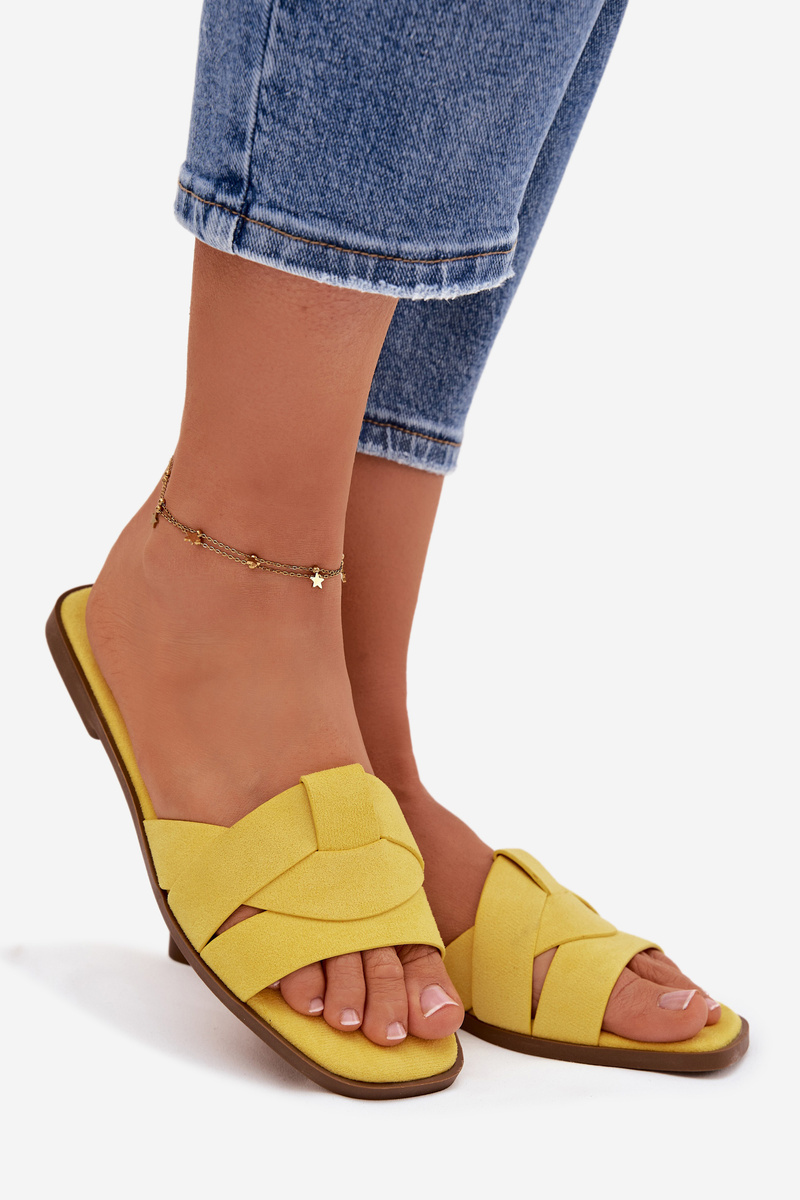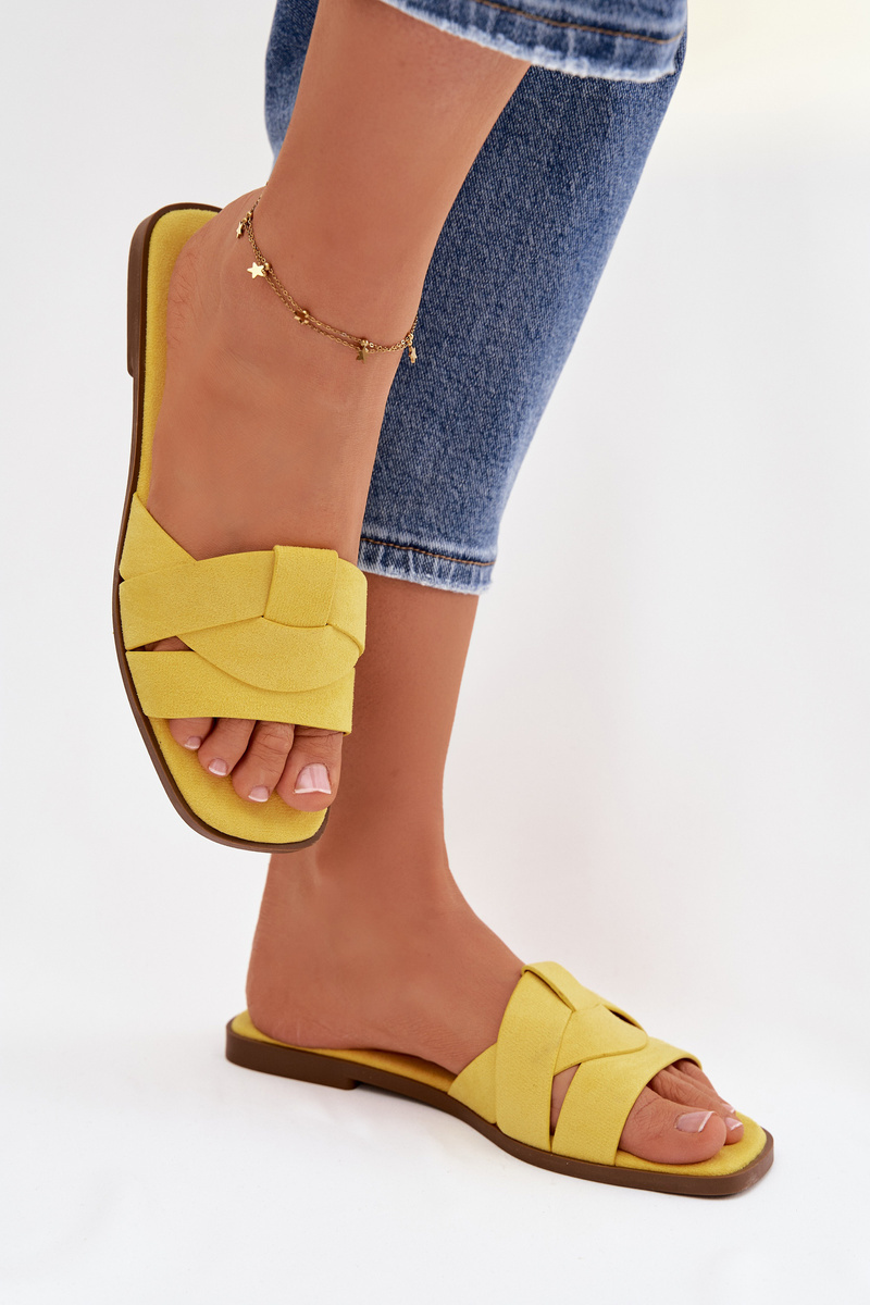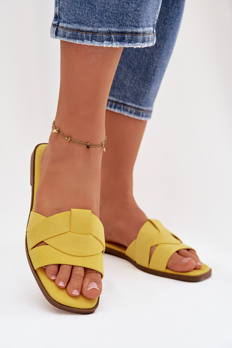 Žluté pantofle z eko semiše krásně doplní jednoduché letní outfity v neutrálních barvách, kde vynikne jejich barva.