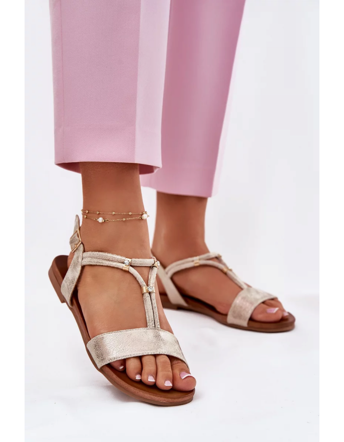 Zlaté ploché sandály krásně doplní letní šaty, sukně i elegantní kalhoty v neutrálních nebo pastelových tónech.