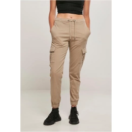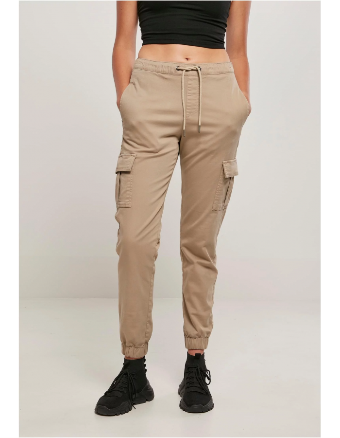 Pružné dámské cargo kalhoty kombinují sebevědomý styl s dokonalým komfortem nošení. Neobvyklé joggingové kalhoty jsou vyrobeny z pohodlného strečového kepru a sedí v pravidelném střihu vysoko v pase. Pas se nastavuje pomocí stahovacích šňůrek s vysoce kvalitními kovovými špičkami a manžety jsou elastické. Styl definují dvě cargo kapsy na stehnech a zakončené dvěma praktickými bočními kapsami.