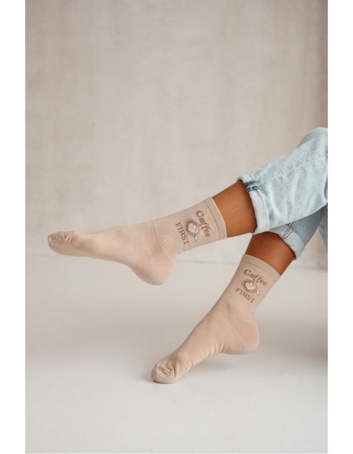 Pohodlné dámské ponožky v béžovém odstínu s jemným designem Coffee FIRST. Příjemný materiál zajišťuje komfort a prodyšnost, vhodné pro každodenní nošení doma i venku.