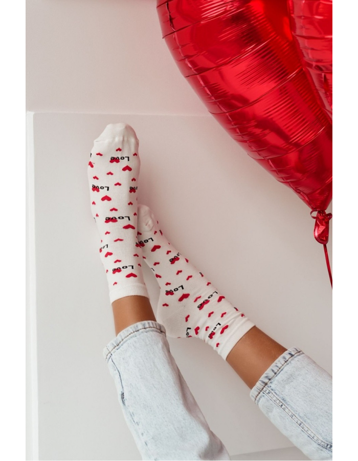 Jemné dámské ponožky v odstínu ecru zdobené decentním nápisem „Love“. Jsou měkké, pohodlné a díky příjemnému materiálu ideální pro celodenní nošení. Stylový detail dodá outfitu nádech romantiky.