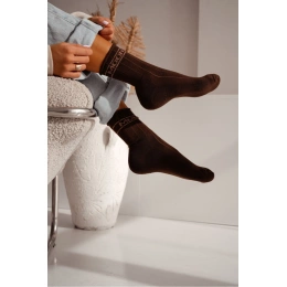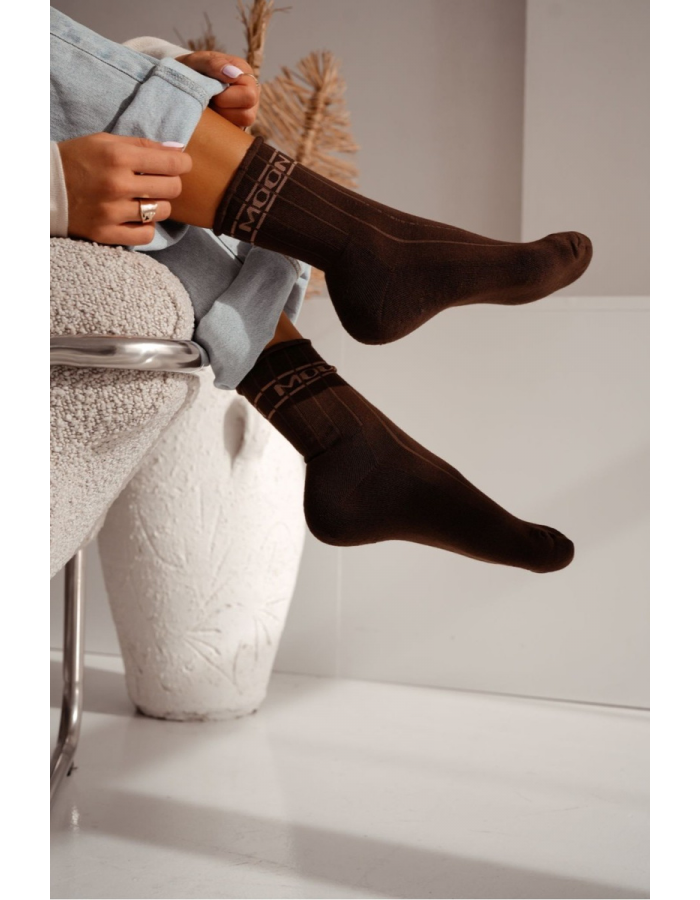Dámské polofroté ponožky MOON v tmavě hnědém odstínu, navržené pro maximální pohodlí díky bezuciskovému lemu. Příjemný materiál zajišťuje měkkost a prodyšnost, ideální pro celodenní nošení, zejména pro citlivé nohy.