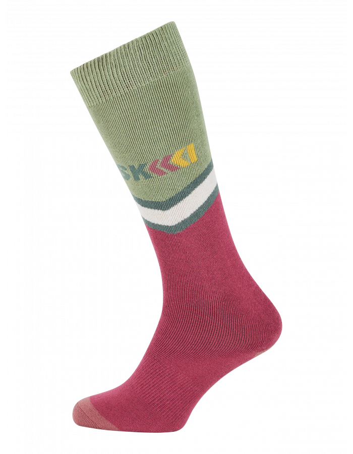 Roztomilé pruhy a design inspirovaný šipkami s nápisem „SKI“ v zelené, růžové, žluté a bílé barvě dodávají těmto ponožkám zábavný vzhled.