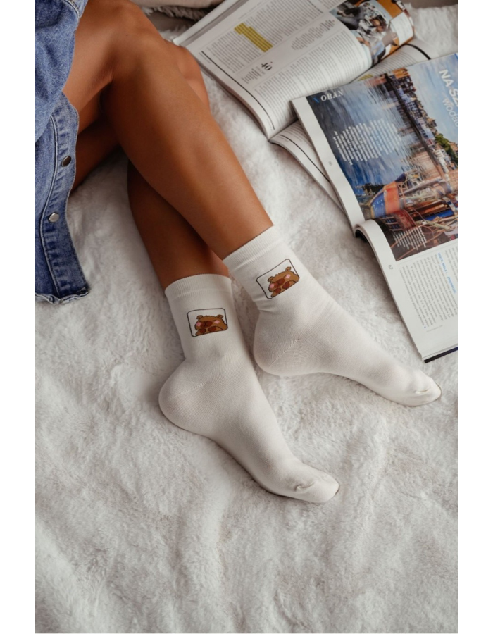 Ecru dámské ponožky s motivem kapibary jsou měkké, pohodlné a ideální pro každodenní nošení. Kvalitní materiál zajišťuje příjemný pocit po celý den a dobrou prodyšnost.