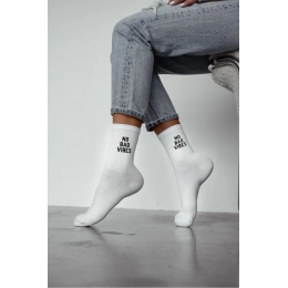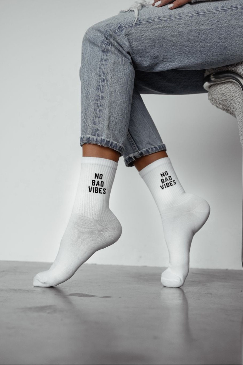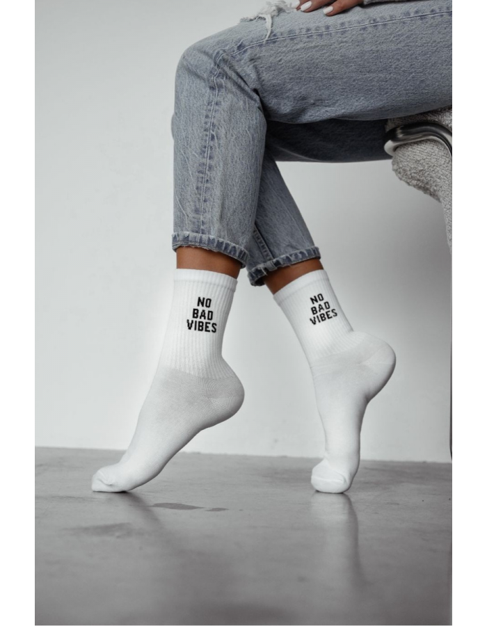 Dámské bílé ponožky s nápisem „NO BAD VIBES“ jsou výrazným, ale stále snadno kombinovatelným doplňkem pro každodenní nošení. Bílý základ působí čistě a svěže, zatímco nápis dodá outfitu moderní a lehce hravý detail, který vynikne hlavně v teniskách a sneakers. Ponožky se hodí do města, do školy i na volný čas a snadno je sladíte s džínami, šortkami i sportovně laděnými outfity.