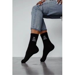 Dámské černé ponožky s nápisem „NO BAD VIBES“ jsou výrazným doplňkem, který dodá outfitu moderní a lehce hravý detail. Černý základ je praktický a snadno kombinovatelný, takže ponožky využijete k teniskám i běžné městské obuvi a snadno je sladíte s většinou oblečení. Kontrastní nápis zaujme na první pohled, přitom působí jednoduše a stylově, takže se ponožky hodí na každodenní nošení do práce i ve volném čase.