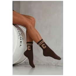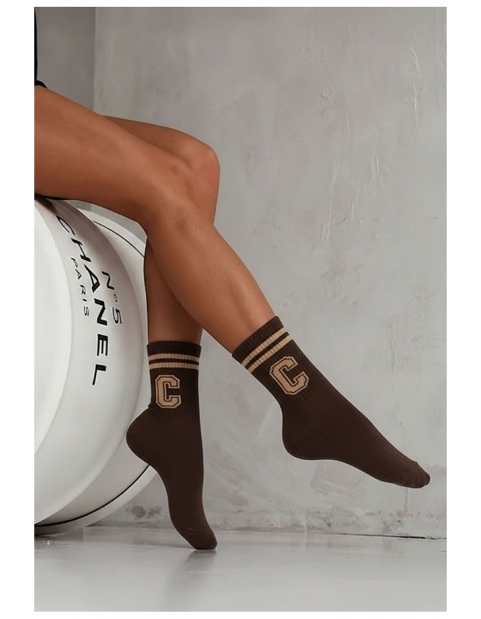 Čokoládové dámské ponožky s jemnými proužky a dekorativním písmenem C jsou měkké, pohodlné a vhodné pro každodenní nošení. Kvalitní materiál zajišťuje příjemný pocit po celý den a dobrou prodyšnost.