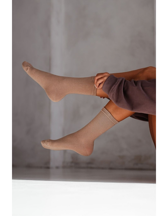 Béžové dámské ponožky s jemným proužkovým vzorem jsou měkké, pohodlné a vhodné pro každodenní nošení. Kvalitní materiál zajišťuje příjemný pocit po celý den a dobrou prodyšnost.