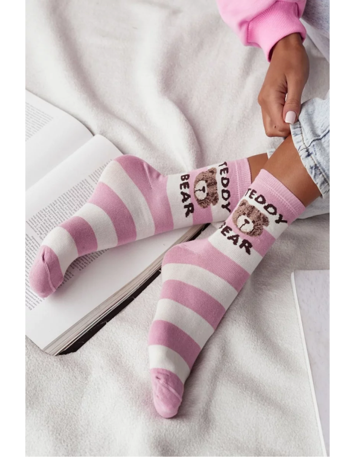 Růžovo-bílé dámské ponožky s proužky a motivem Teddy Bear jsou měkké, pohodlné a ideální pro každodenní nošení. Kvalitní materiál zajišťuje příjemný pocit po celý den a dobrou prodyšnost. Roztomilý medvídkový motiv spolu s jemnými proužky dodává ponožkám hravý a veselý vzhled.