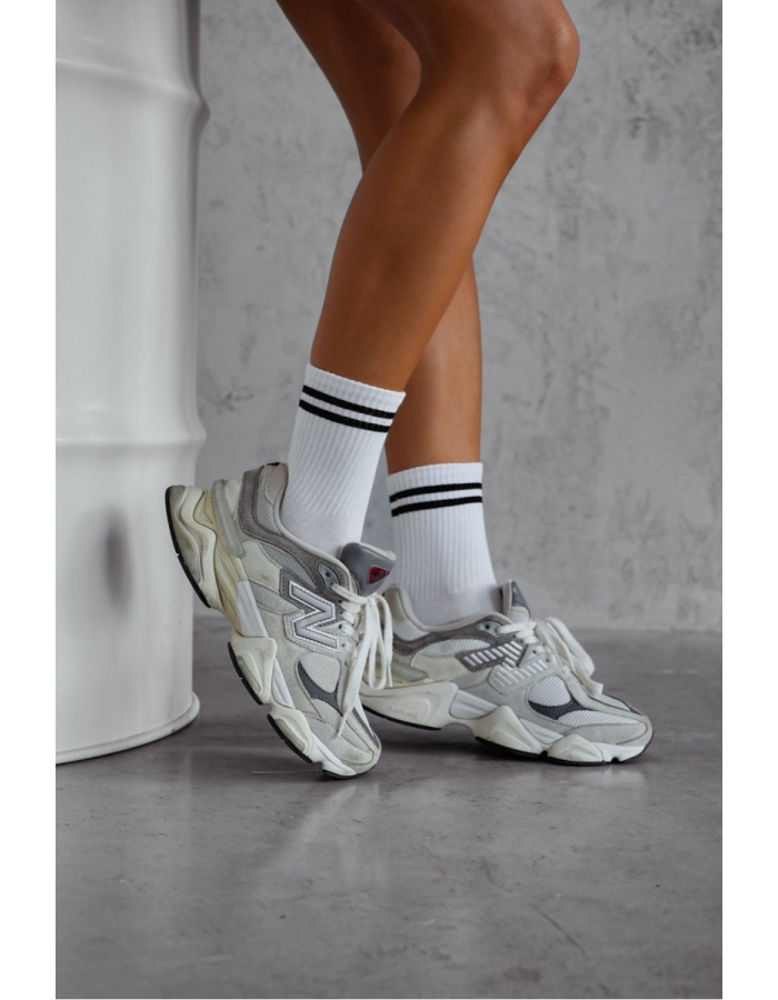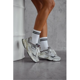 Bílé dámské ponožky se dvěma tenkými proužky jsou měkké, pohodlné a ideální pro každodenní nošení. Kvalitní materiál zajišťuje příjemný pocit po celý den a dobrou prodyšnost. Jemné proužky dodávají ponožkám moderní a nenápadný detail.