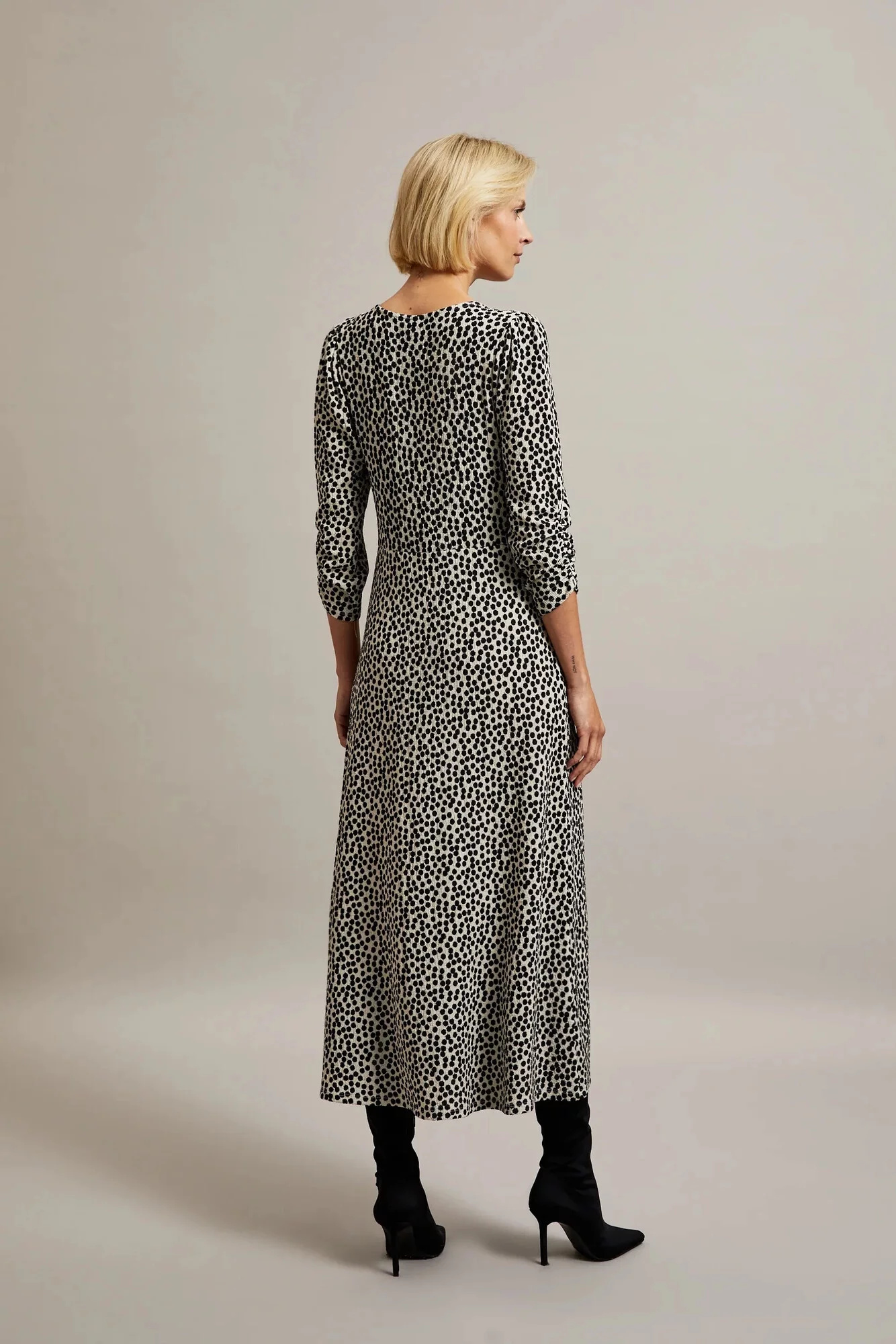 97%POLYESTER, 3%ELASTAN Šaty v béžové barvě s černými puntíky jsou ideální volbou pro každou ženu, která si cení klasiky a elegance. Vyrobena z vysoce kvalitního polyesteru, okouzluje nabíranými rukávy a řasením, které jí dodávají půvab. Potisk s puntíky dodává šatům jedinečný charakter a pletená tkanina zajišťuje, že jsou mimořádně pohodlné na nošení. Výstřih do V zdůrazňuje ženské přednosti a střih do tvaru lichoběžníku dokonale zvýrazňuje postavu. Šaty jsou vhodné jak pro speciální příležitosti, tak i na každodenní nošení do práce. Dokonale se hodí jak v kombinaci s elegantními lodičkami, tak s teniskami nebo kotníkovými botami na každý den. Ideální nabídka pro ženy, které si cení pohodlí a stylu.