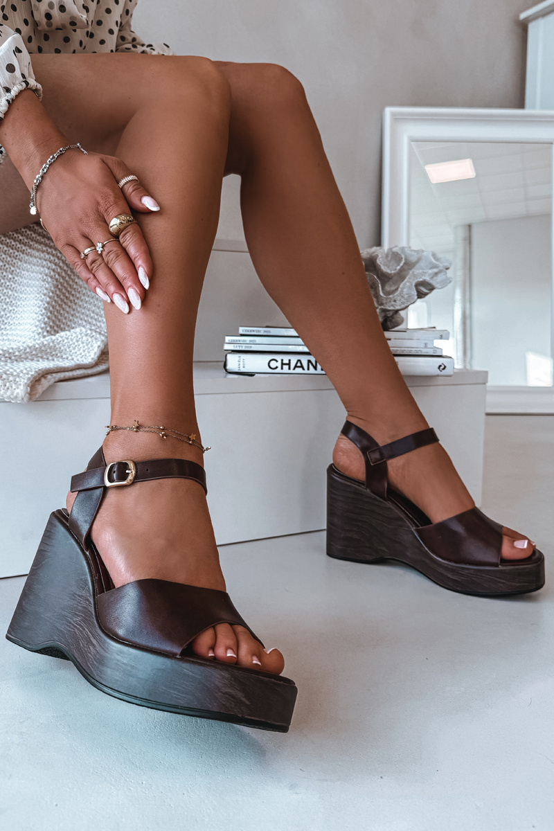 Čokoládové sandály na klínku krásně doplní outfit v béžových, krémových nebo přírodních tónech a podtrhnou letní eleganci.