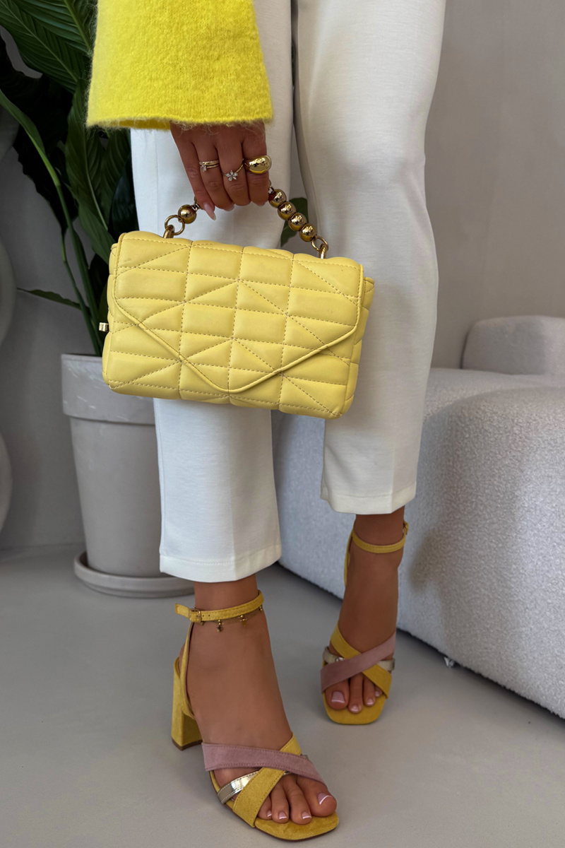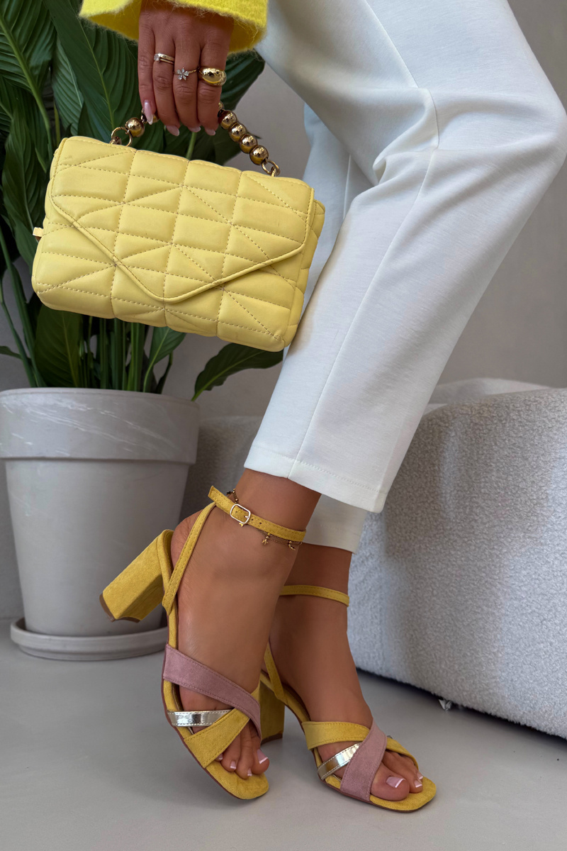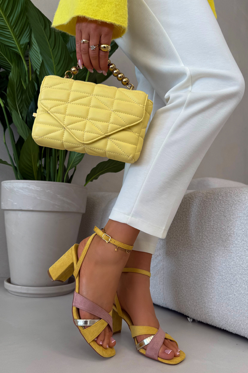 Žluté sandály na sloupku krásně doplní jednoduché outfity v neutrálních barvách, kde vynikne jejich barva a elegantní silueta.