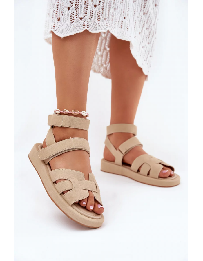 Béžové sandály se suchými zipy se skvěle hodí k letním šatům, šortkám i lehkým kalhotám v přírodních tónech.