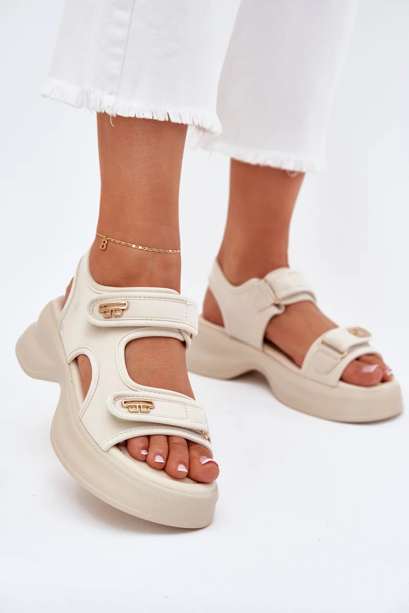 Béžové sandály se zlatými detaily krásně vypadají s neutrálními barvami (např. bílá, černá, khaki) nebo pastelovými odstíny pro svěží letní look.