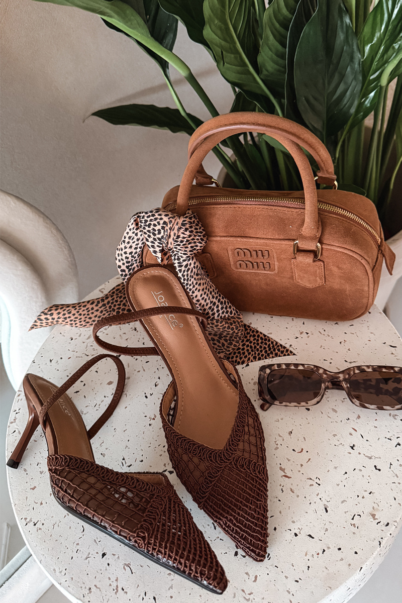 Hnědé sandály z pleteného materiálu se skvěle hodí k šatům, sukním i kalhotám v béžových, krémových nebo zemitých odstínech.