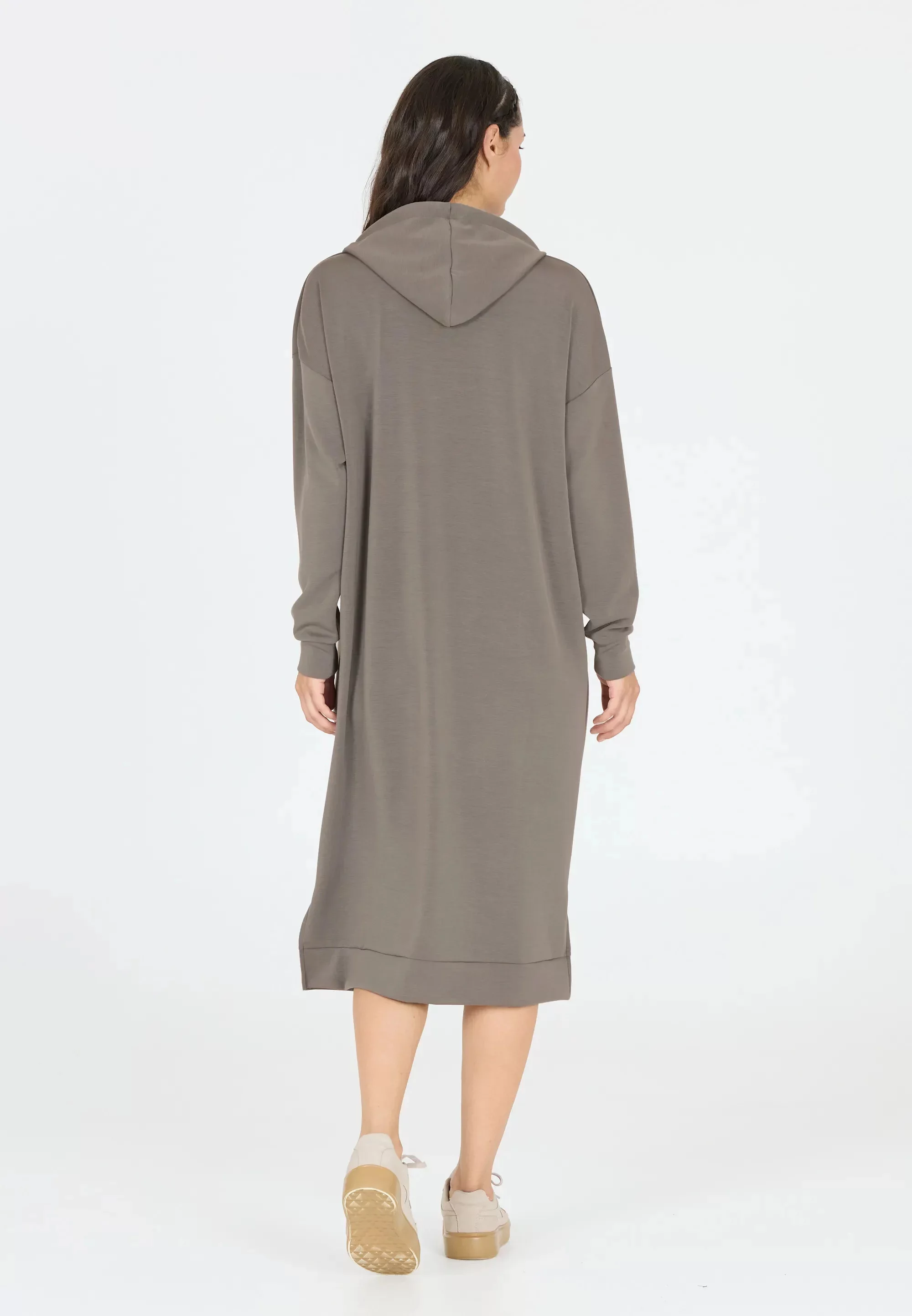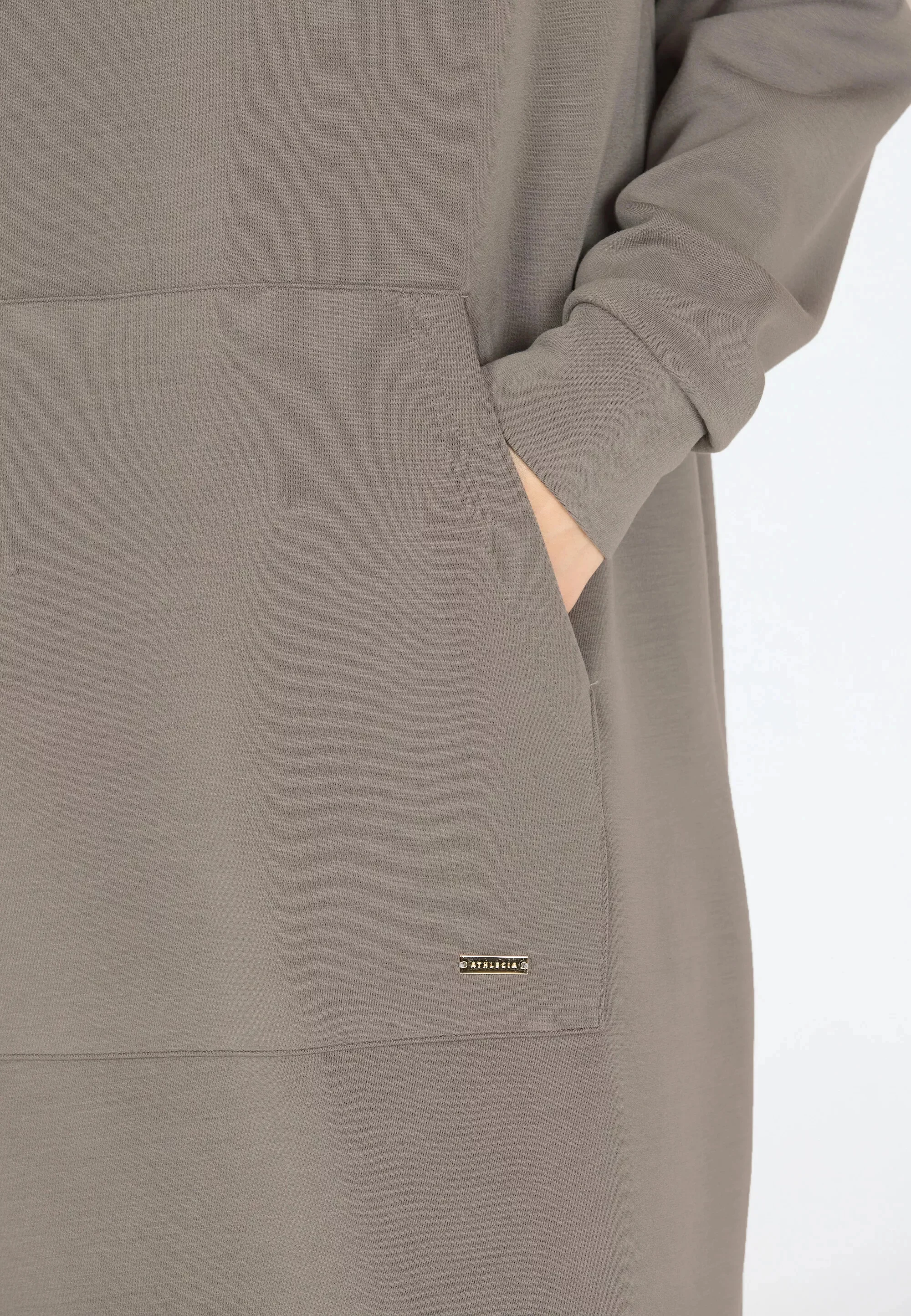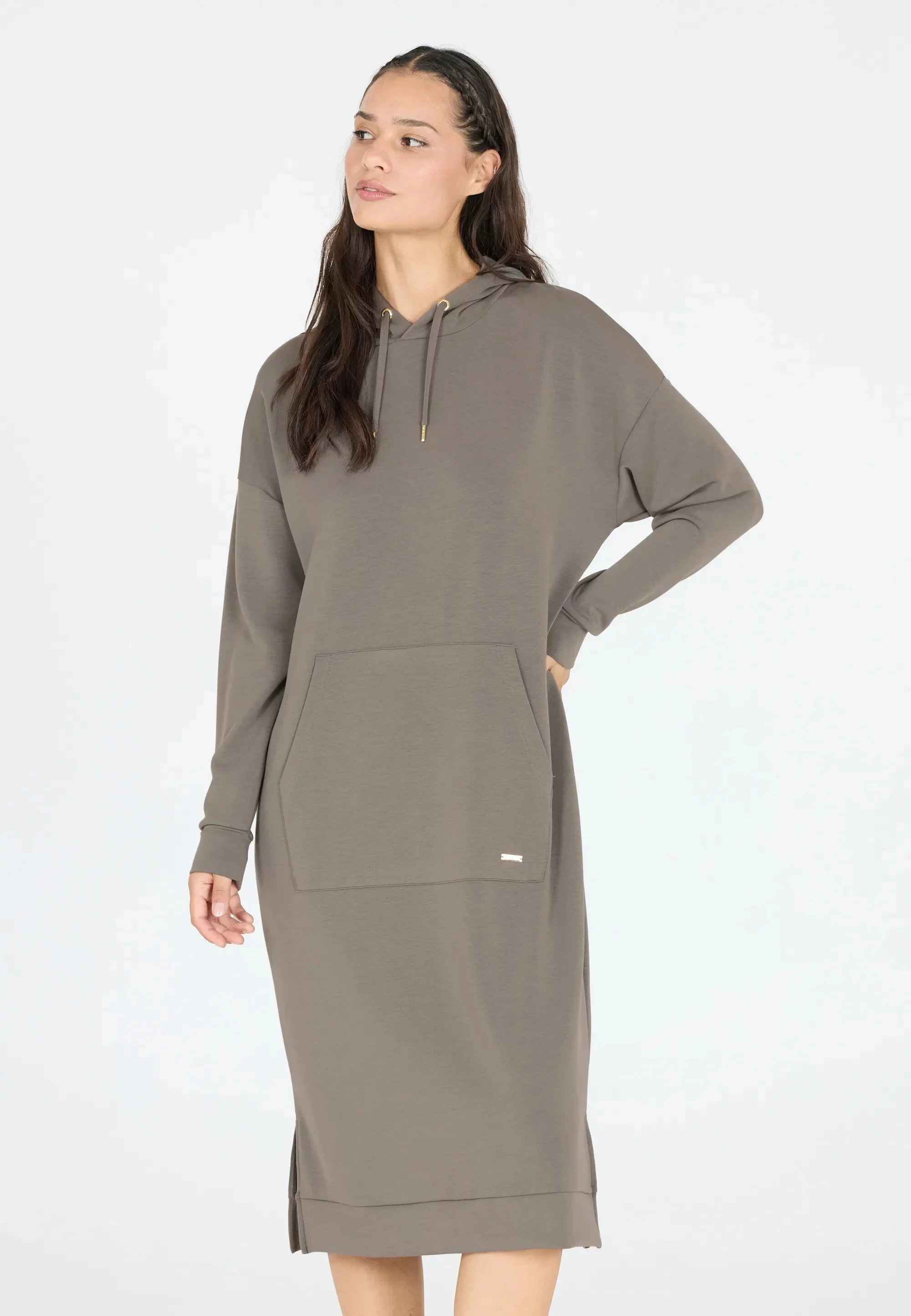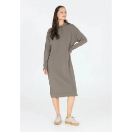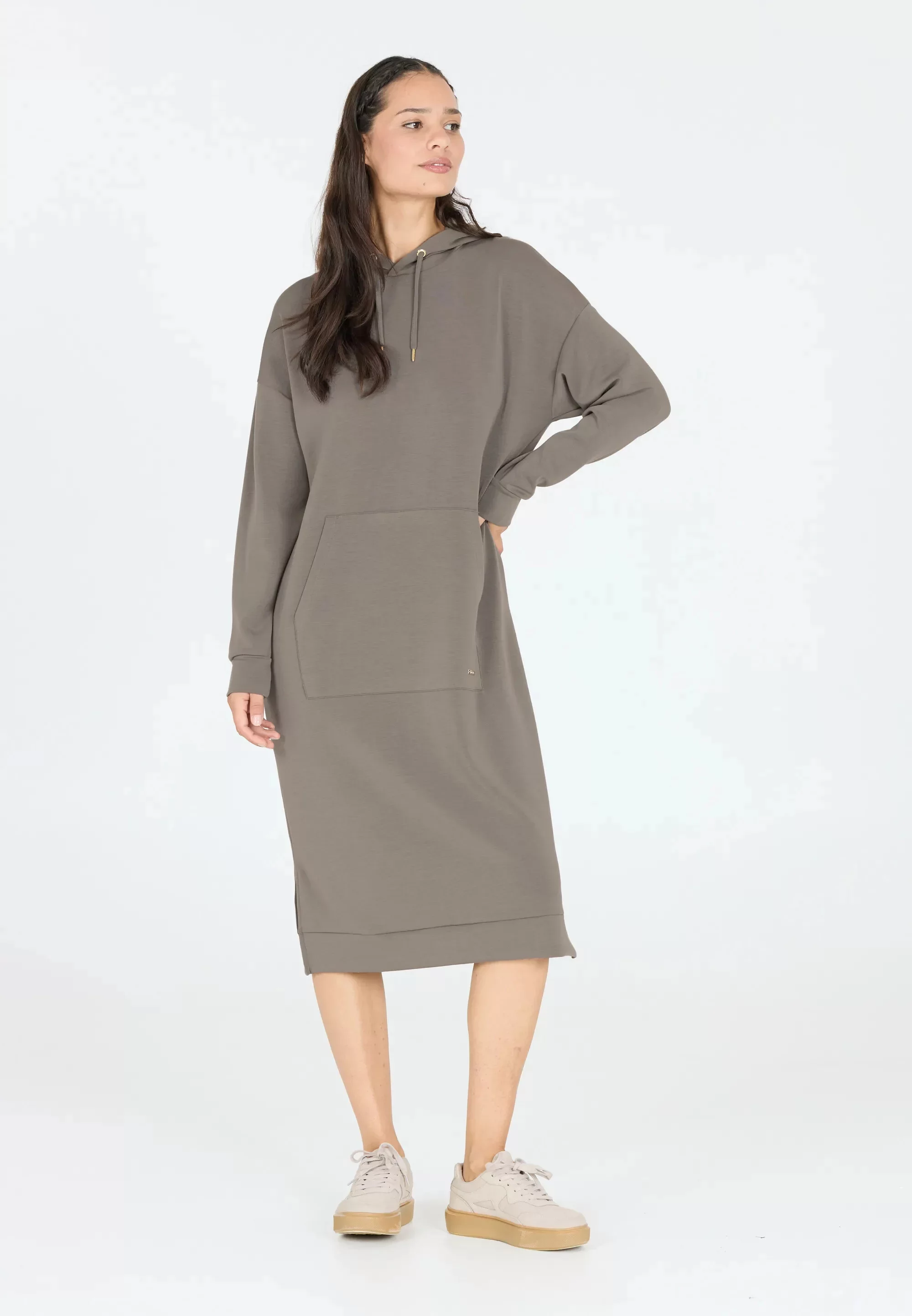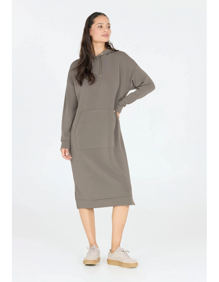 Oversized střih s dlouhými rukávy a kapucí dodává šatům ležérní vzhled, zatímco velká klokaní kapsa v přední části přidává praktický prvek.
