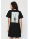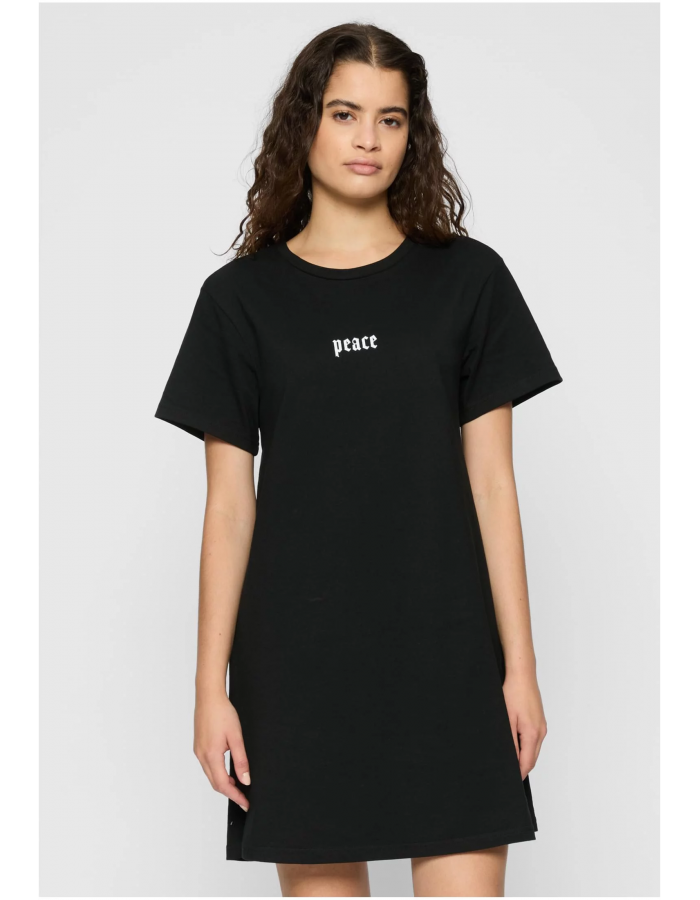 Černé tričko šaty s minimalistickým designem. Na přední straně je jednoduchý nápis "peace" v bílém gotickém písmu, který přidává jemný, ale výstižný detail. Zadní strana trička obsahuje velký černobílý potisk ruky se vztyčeným "V" symbolizujícím mír, což z něj činí stylový a výrazný kousek. Tričko šaty mají rovný střih a jsou vyrobeny z kvalitního materiálu, ideální pro každodenní nošení s nádechem rebelie a stylu.