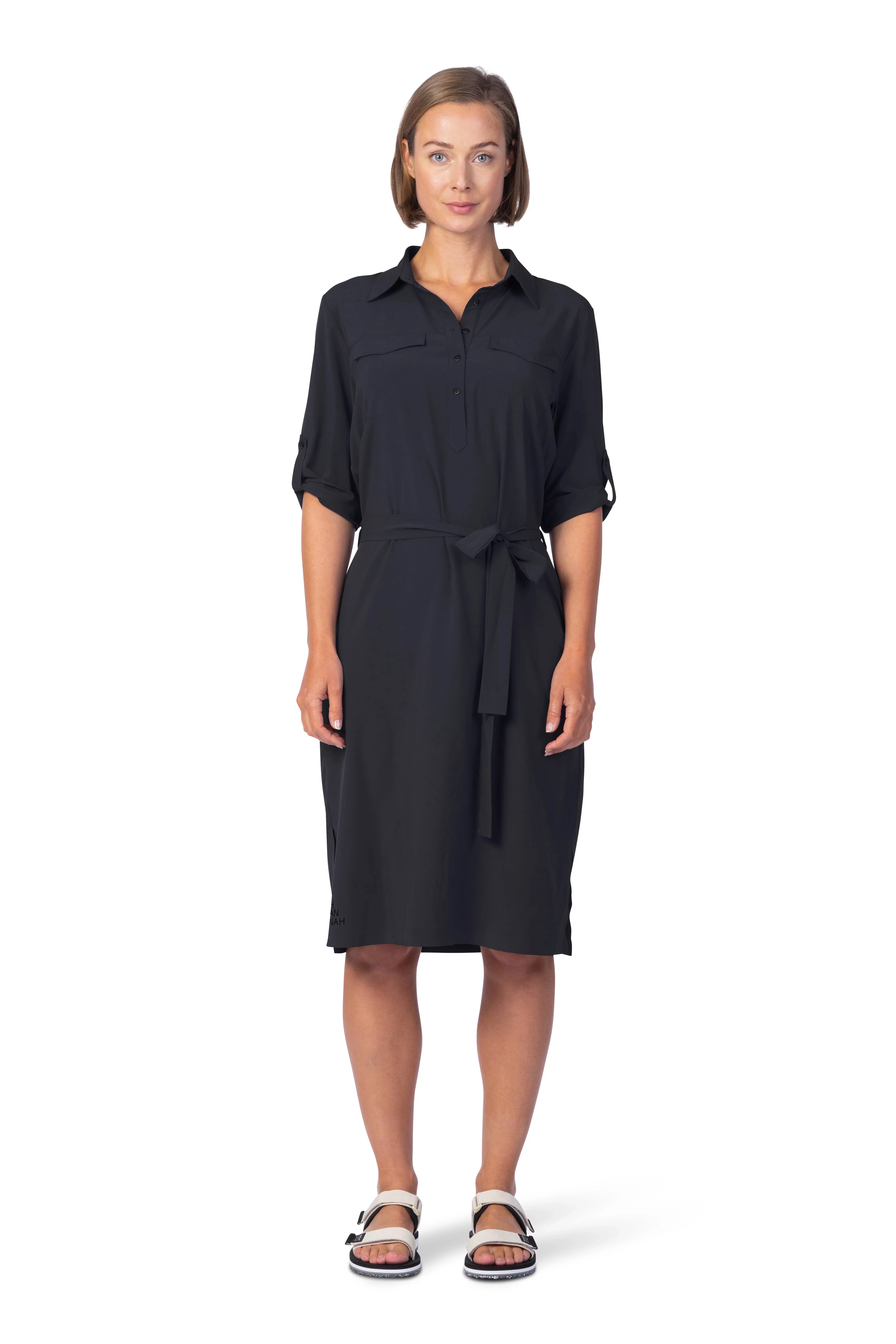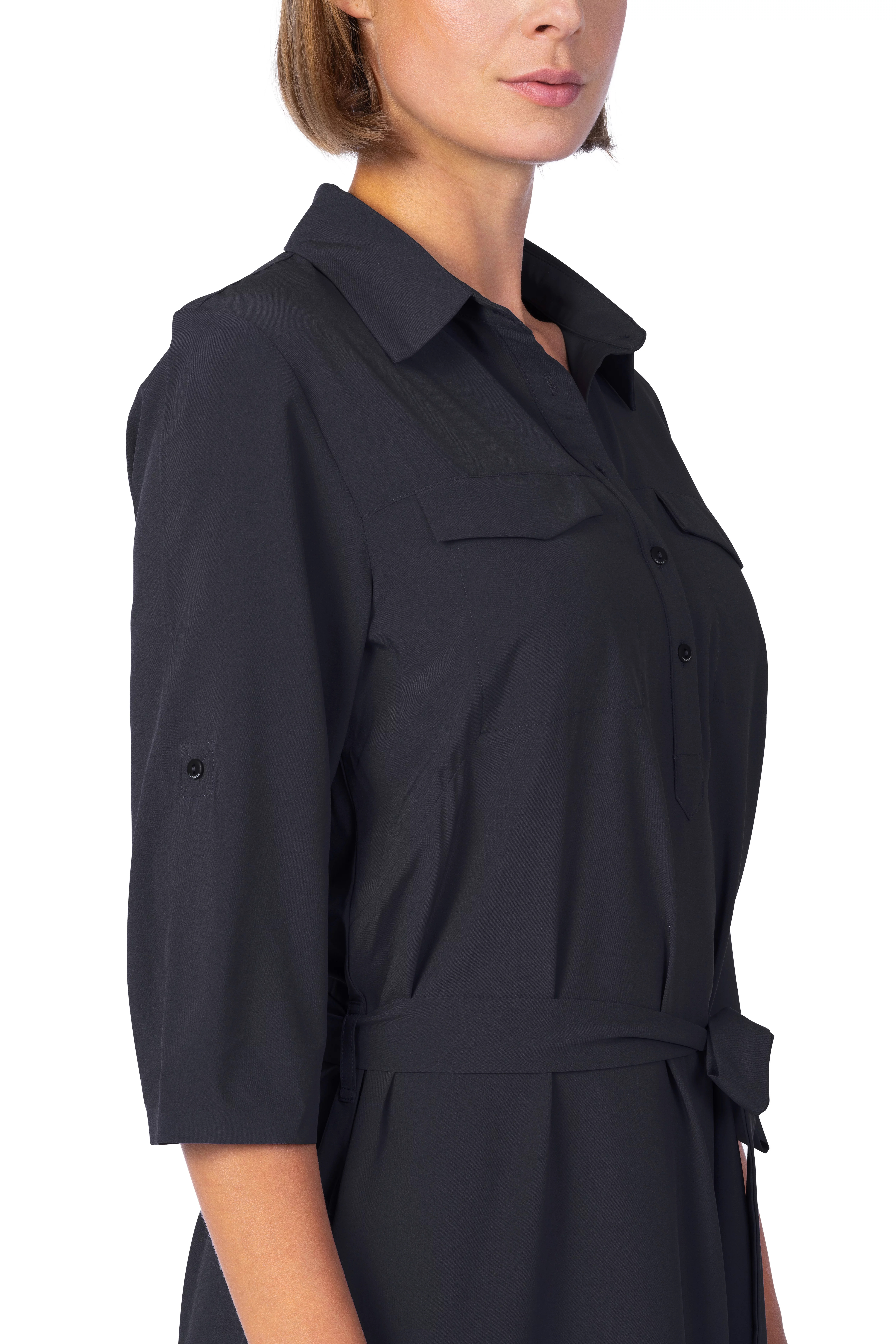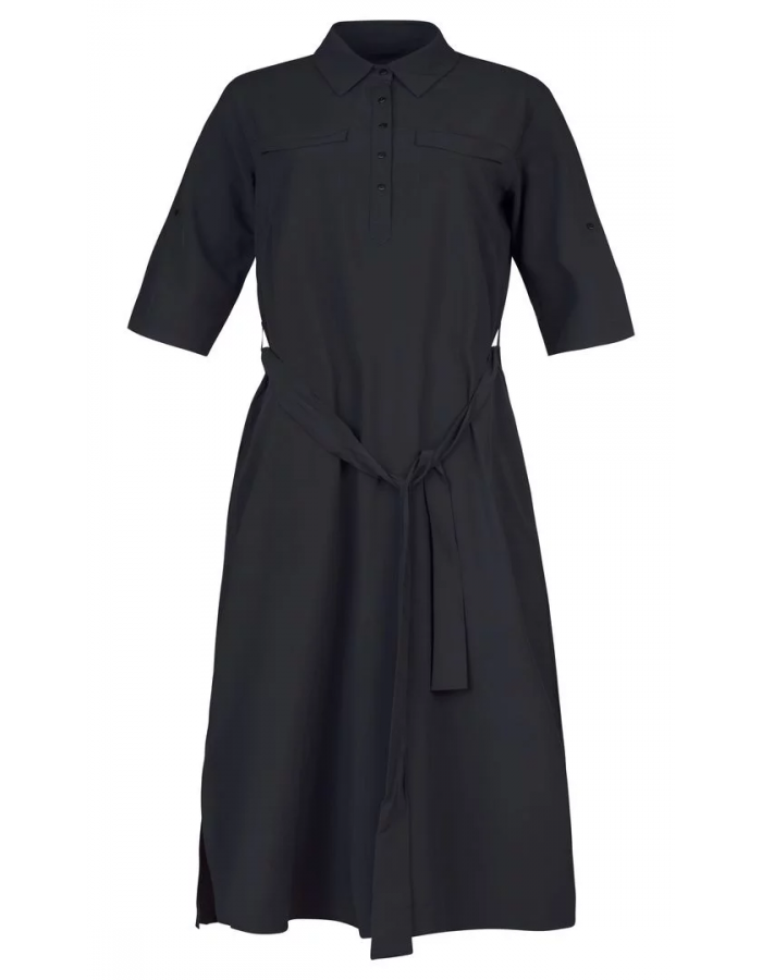Dámské lehoučké šaty s delším rukávem jsou vyrobeny z funkčního a vysoce elastického a prodyšného materiálu AFT Stretch. Neuvěřitelně lehký, jemný a příjemný funkční elastický materiál oceníte během horkých letních dní. Elegantní košilový delší střih nad kolena s páskem v pase.Rukávy lze nosit v delším provedení či ohrnout na kratší délku a zapnout na knoflíček. Lepený dolní kraj i lem rukávů dodává šatům čistý vzhled. Jednobarevné provedení a elegantní styl v kombinaci s funkčností a pohodlím oceníte pro běžné nošení, cestování a volný čas.