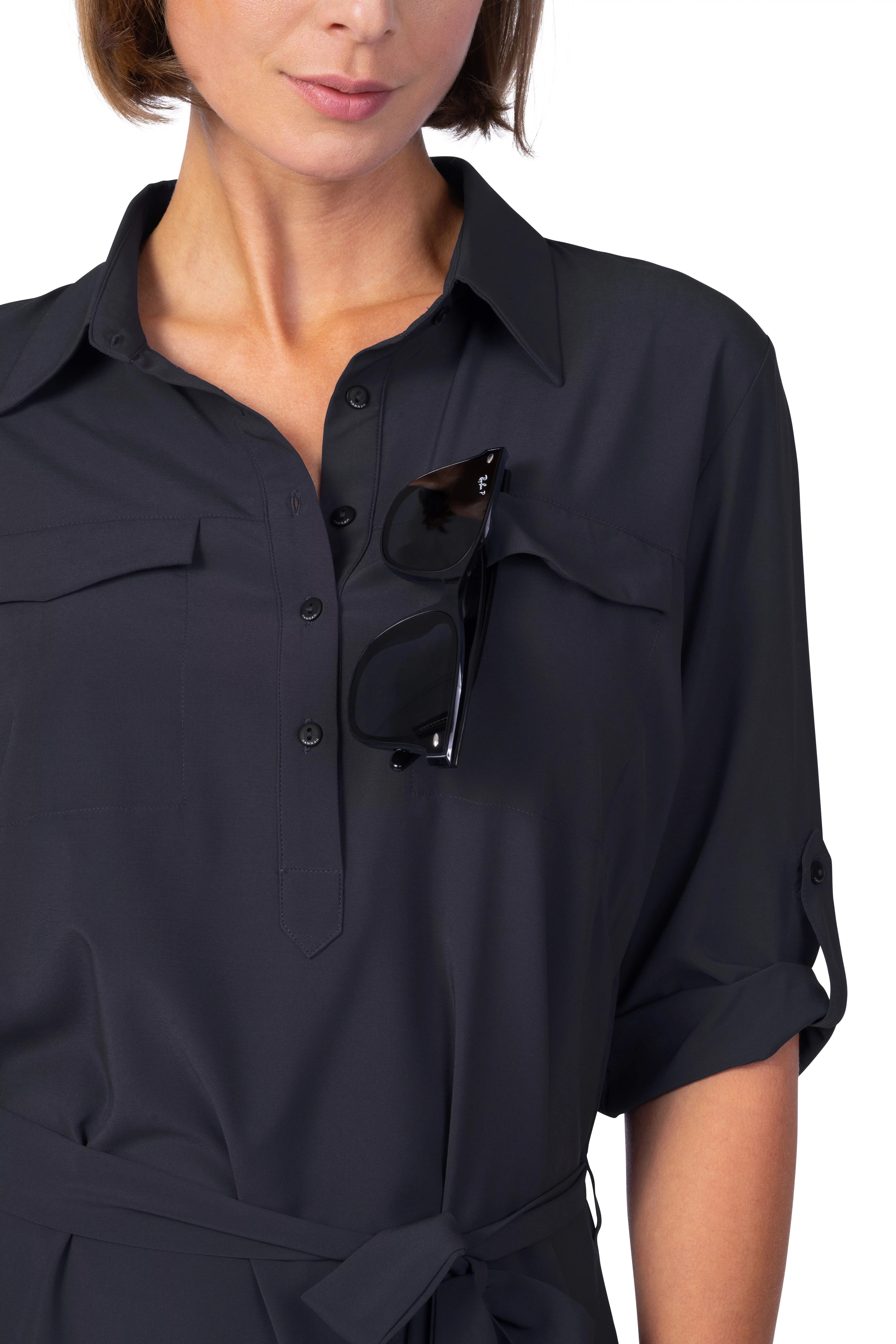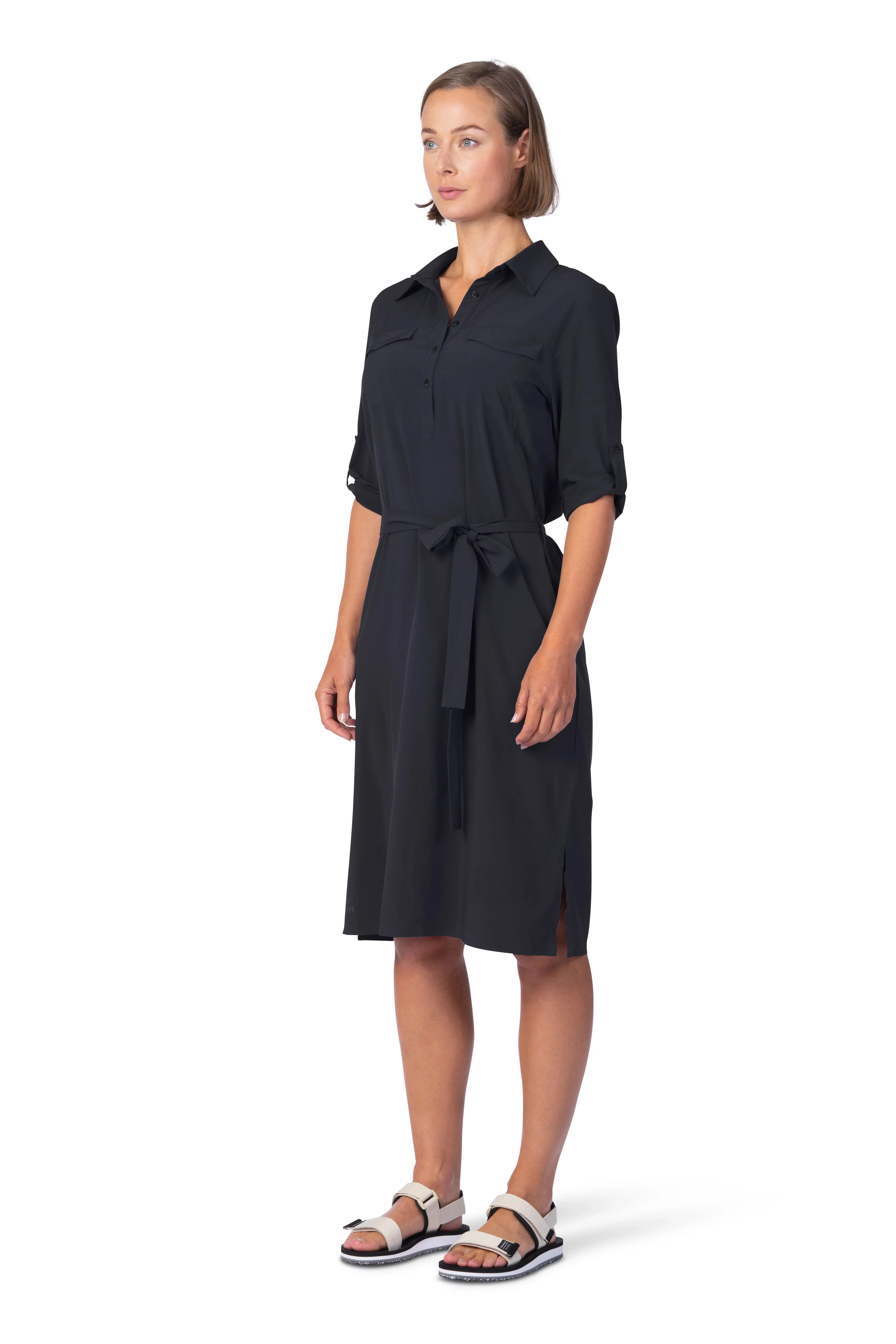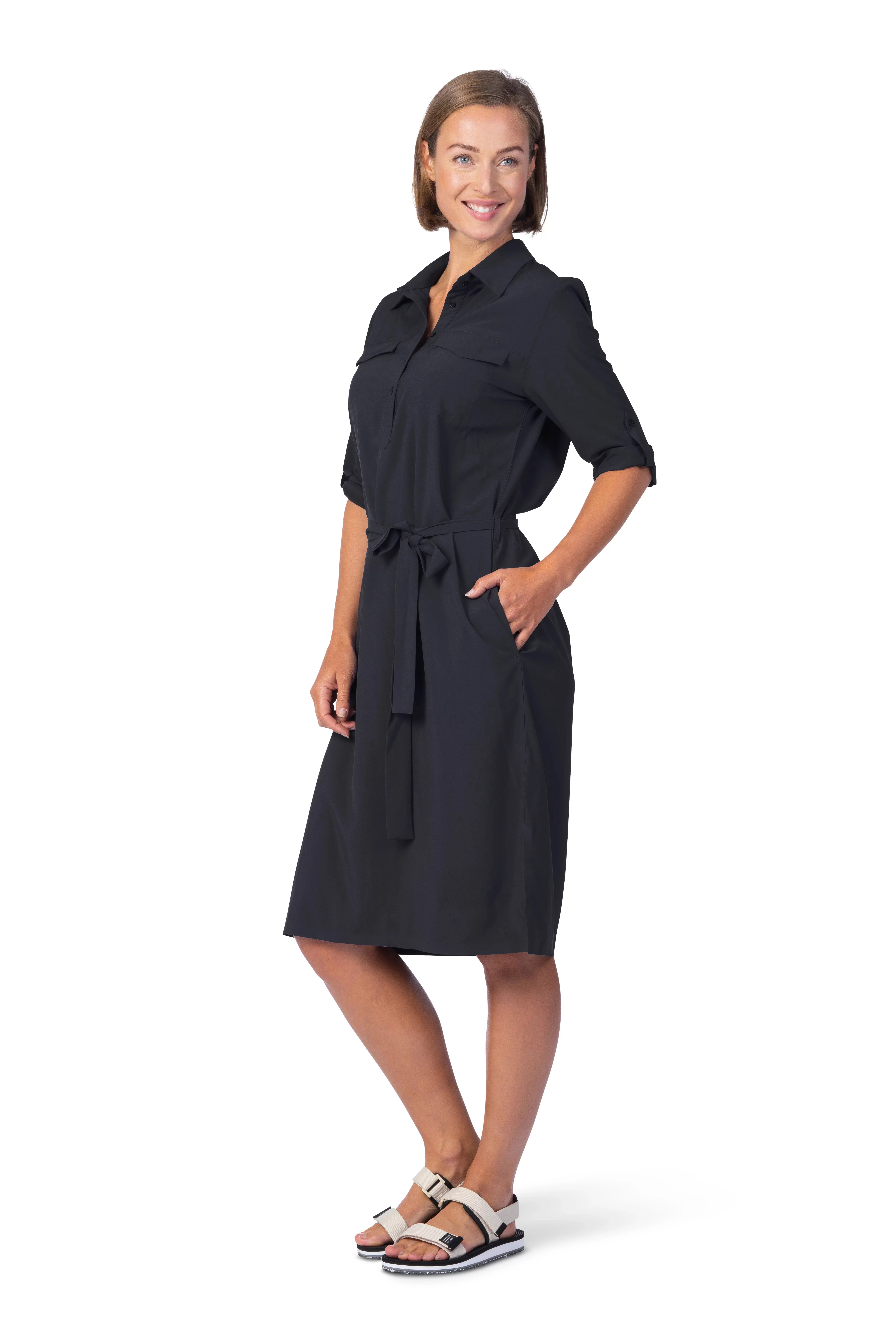 Dámské lehoučké šaty s delším rukávem jsou vyrobeny z funkčního a vysoce elastického a prodyšného materiálu AFT Stretch. Neuvěřitelně lehký, jemný a příjemný funkční elastický materiál oceníte během horkých letních dní. Elegantní košilový delší střih nad kolena s páskem v pase.Rukávy lze nosit v delším provedení či ohrnout na kratší délku a zapnout na knoflíček. Lepený dolní kraj i lem rukávů dodává šatům čistý vzhled. Jednobarevné provedení a elegantní styl v kombinaci s funkčností a pohodlím oceníte pro běžné nošení, cestování a volný čas.