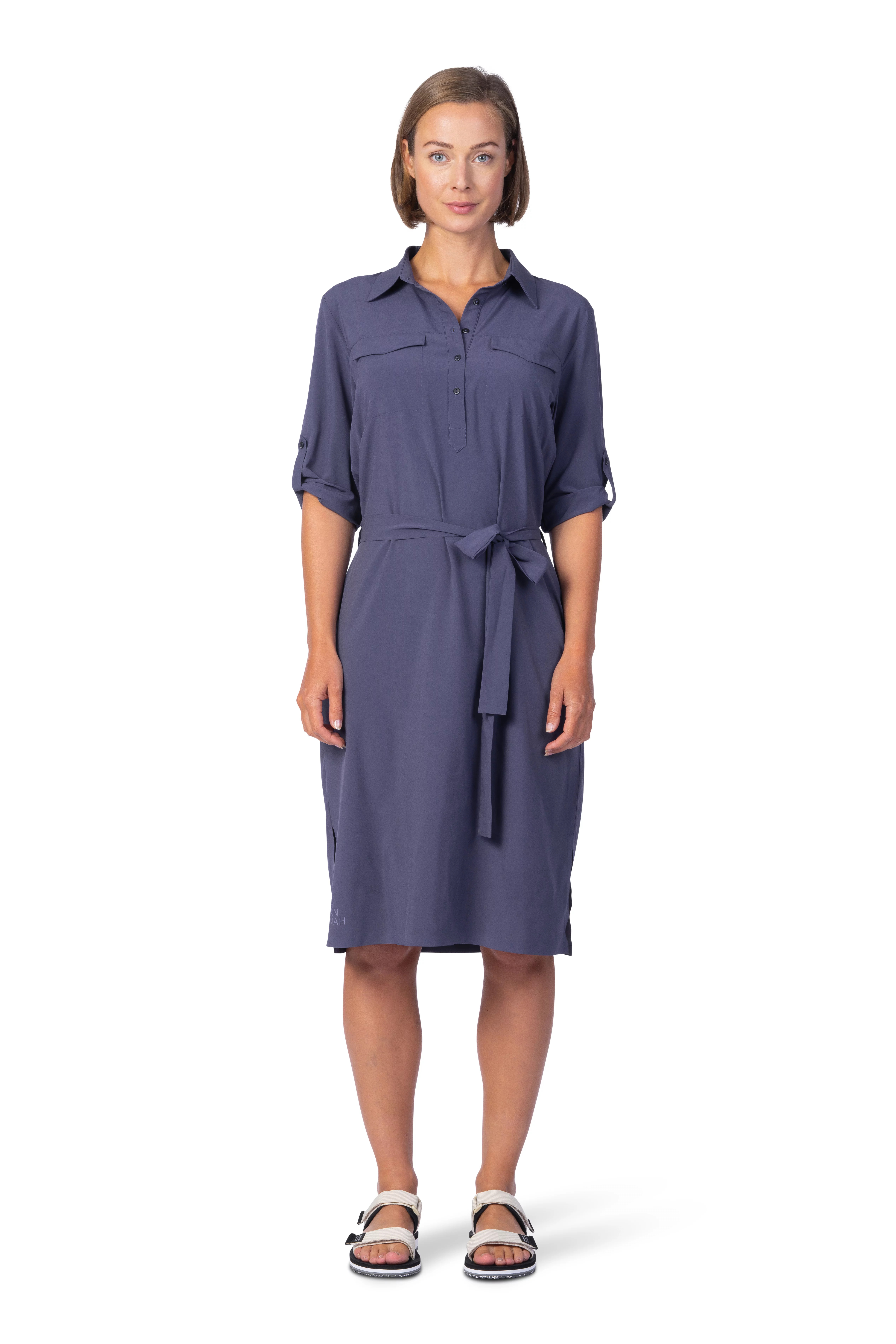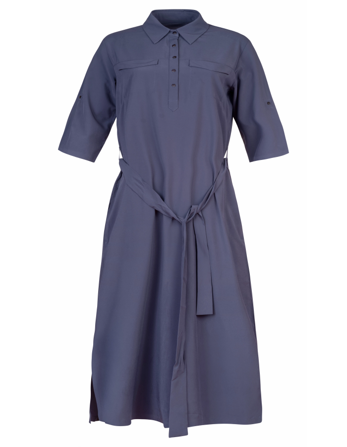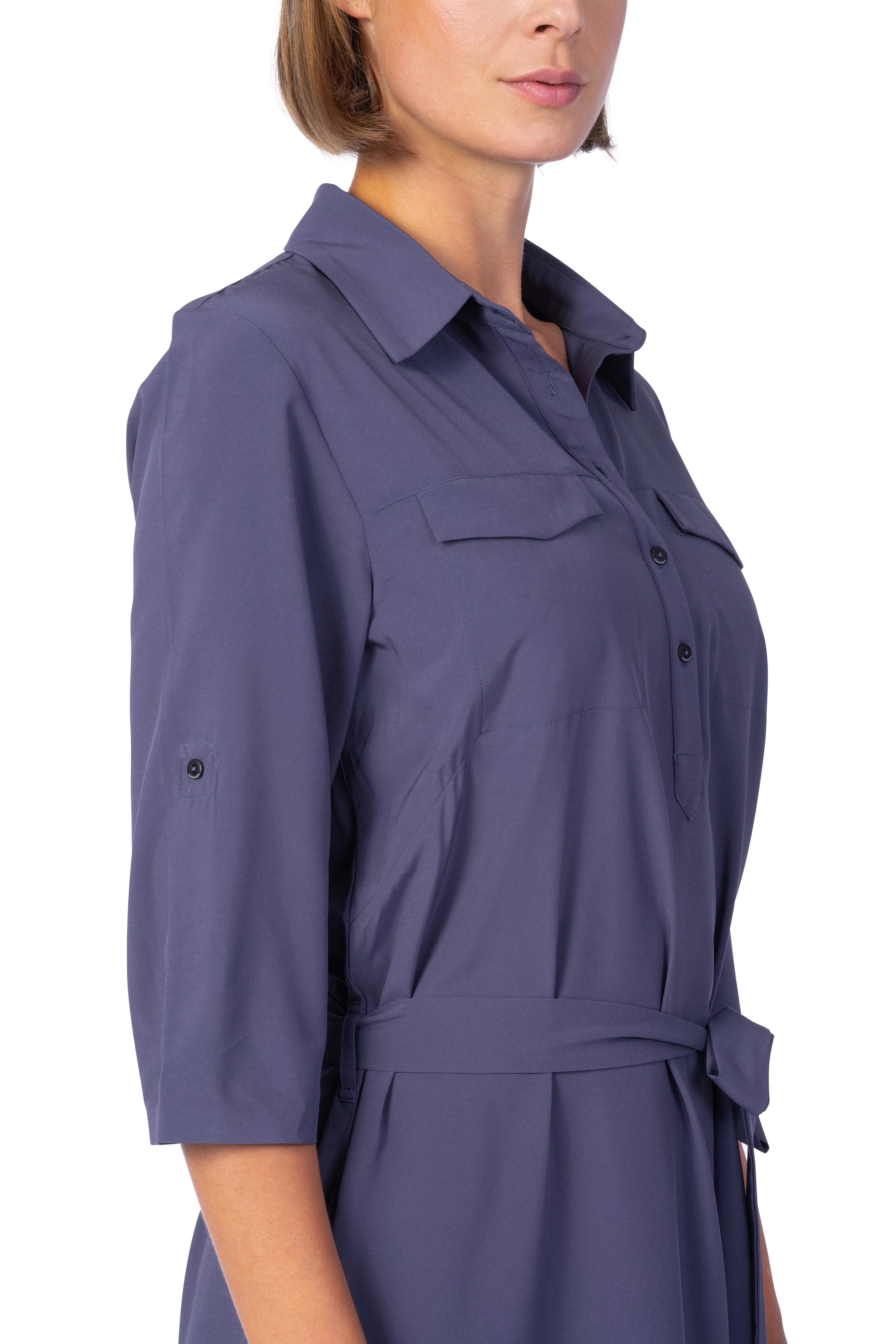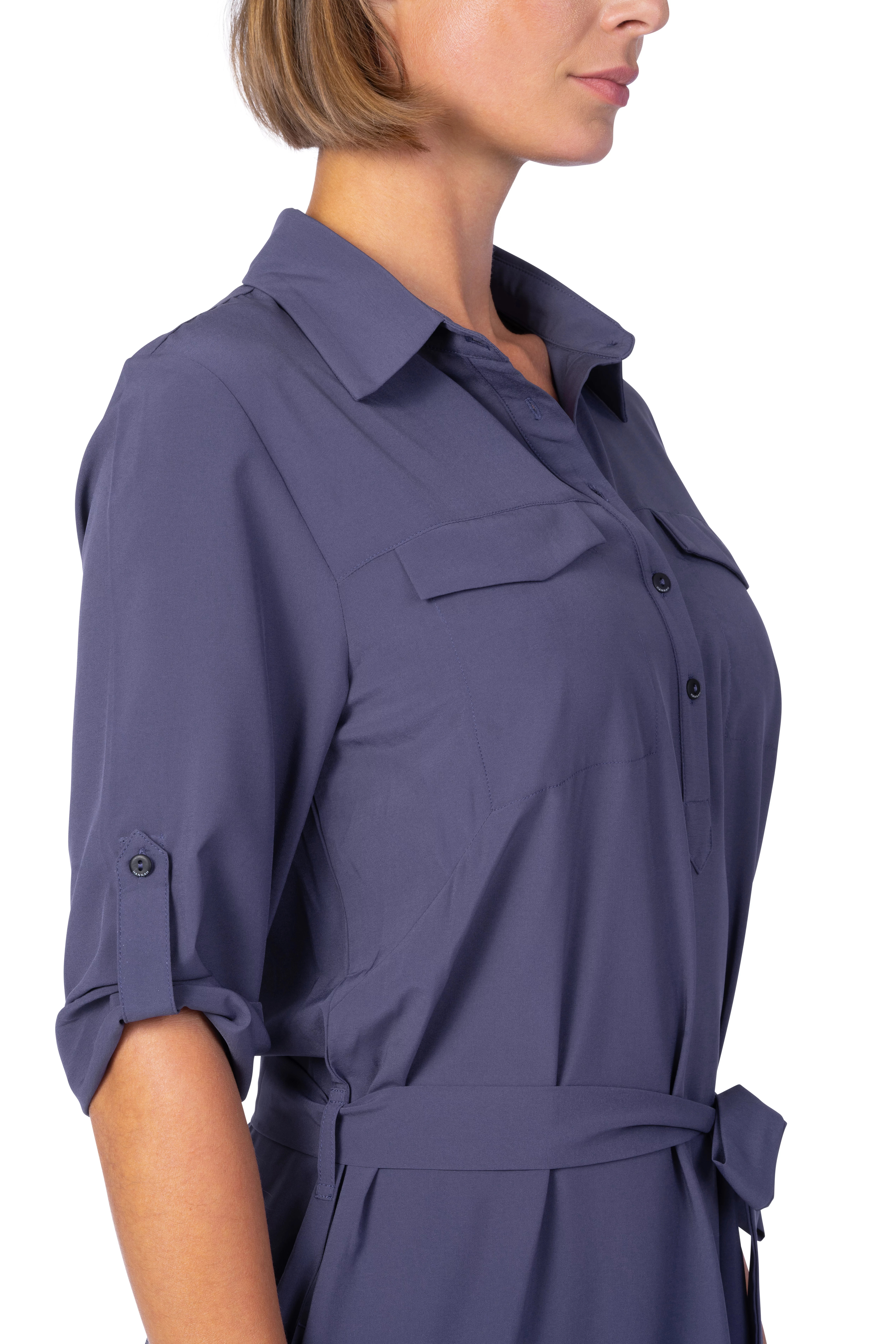 Dámské lehoučké šaty s delším rukávem jsou vyrobeny z funkčního a vysoce elastického a prodyšného materiálu AFT Stretch. Neuvěřitelně lehký, jemný a příjemný funkční elastický materiál oceníte během horkých letních dní. Elegantní košilový delší střih nad kolena s páskem v pase.Rukávy lze nosit v delším provedení či ohrnout na kratší délku a zapnout na knoflíček. Lepený dolní kraj i lem rukávů dodává šatům čistý vzhled. Jednobarevné provedení a elegantní styl v kombinaci s funkčností a pohodlím oceníte pro běžné nošení, cestování a volný čas.