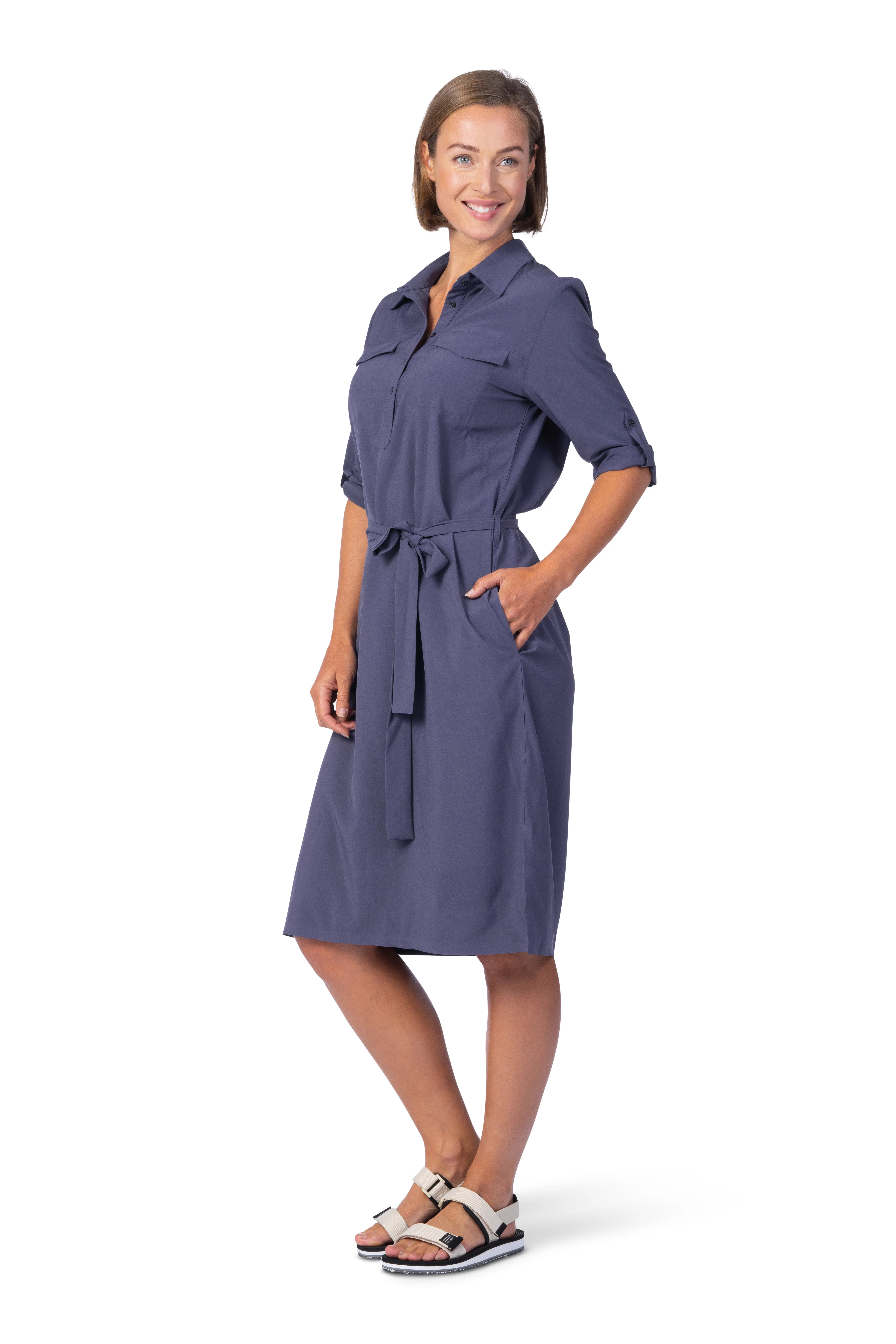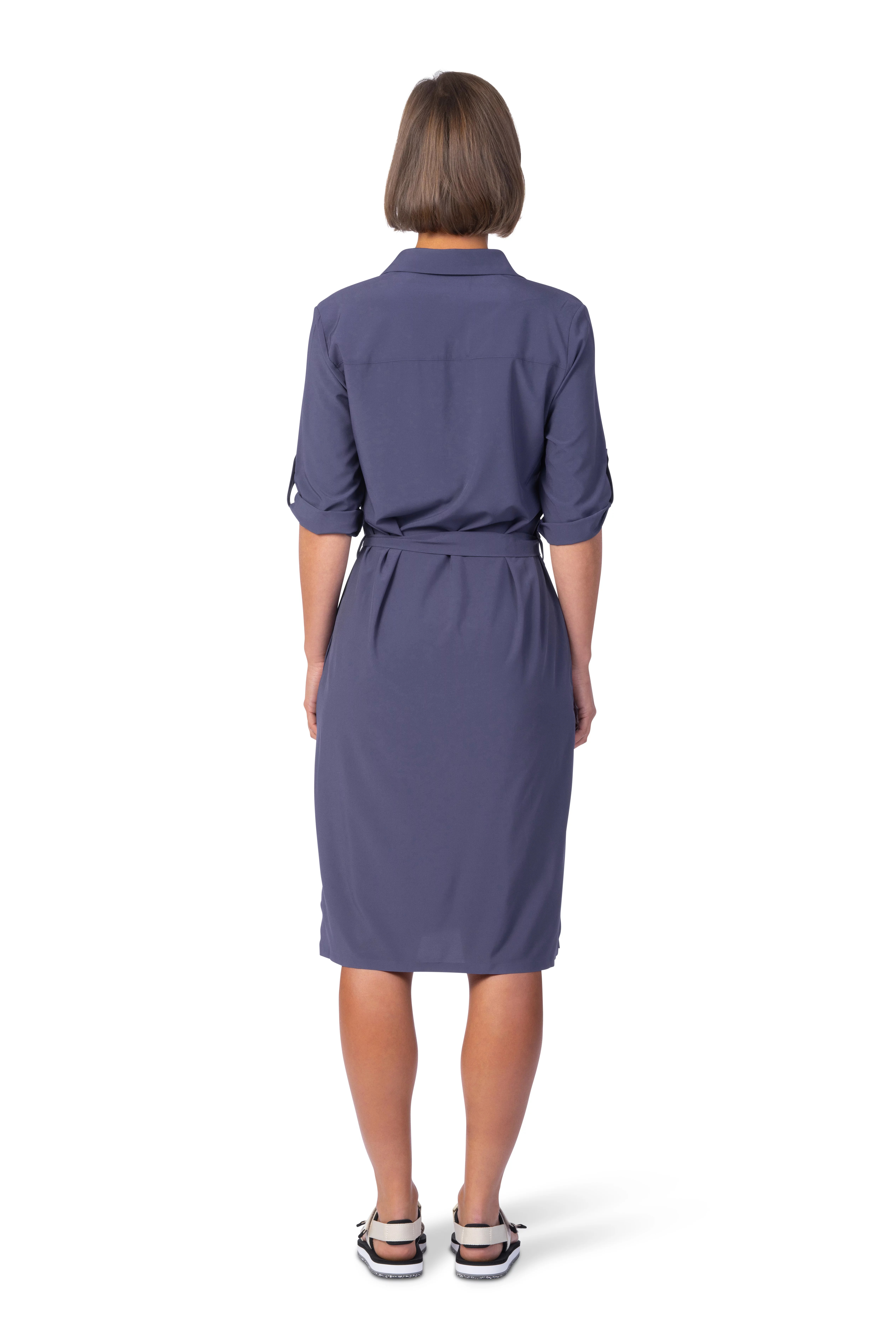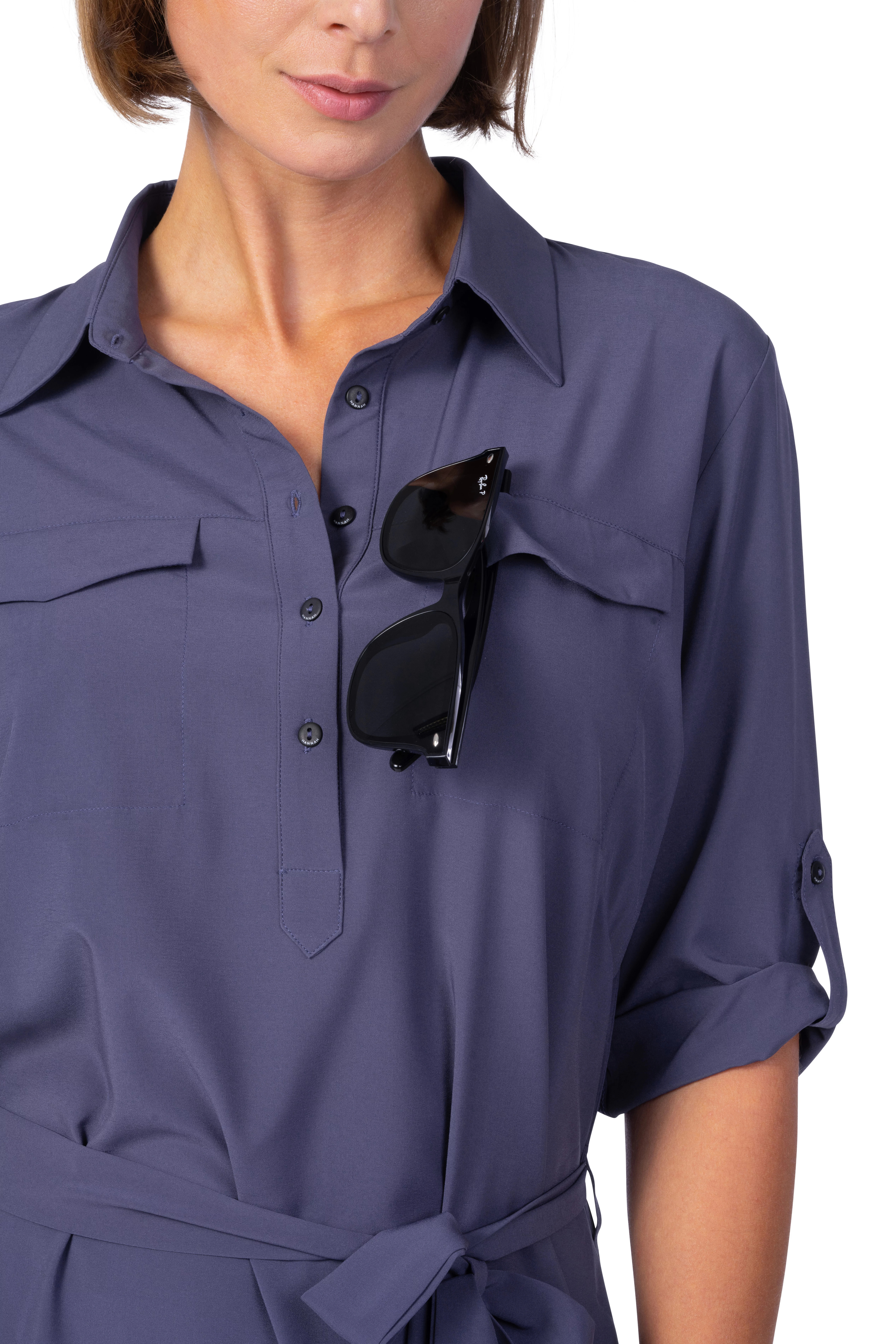 Dámské lehoučké šaty s delším rukávem jsou vyrobeny z funkčního a vysoce elastického a prodyšného materiálu AFT Stretch. Neuvěřitelně lehký, jemný a příjemný funkční elastický materiál oceníte během horkých letních dní. Elegantní košilový delší střih nad kolena s páskem v pase.Rukávy lze nosit v delším provedení či ohrnout na kratší délku a zapnout na knoflíček. Lepený dolní kraj i lem rukávů dodává šatům čistý vzhled. Jednobarevné provedení a elegantní styl v kombinaci s funkčností a pohodlím oceníte pro běžné nošení, cestování a volný čas.
