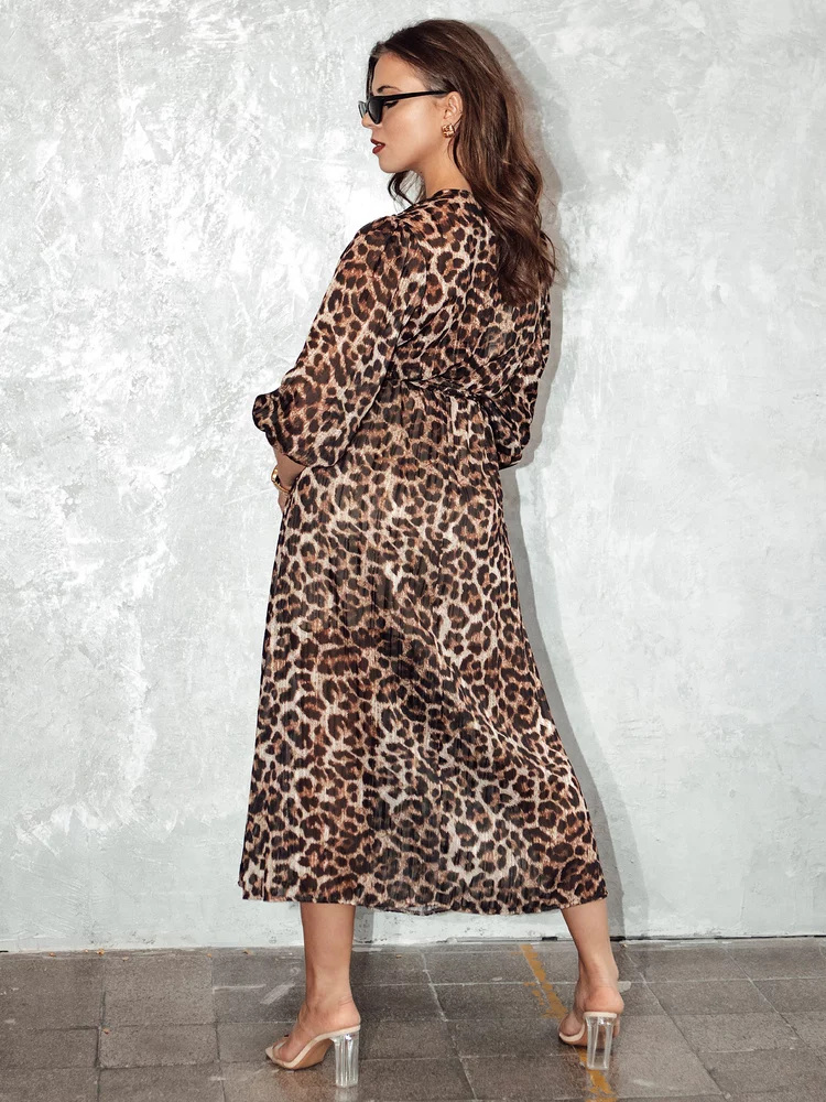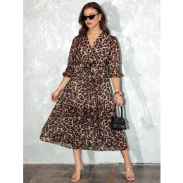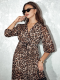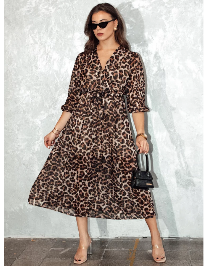 Dlouhé šaty se zvířecím vzorem, které spojují eleganci s výrazností. Dokonalý návrh na večerní výlety, dodává každému outfitu dravý charakter. Lehký materiál a vázaný pásek zdůrazňují postavu, zatímco volný střih zajišťuje pohodlí při nošení. Toto je nabídka pro ženy, které si cení jedinečného stylu a chtějí se odlišit od davu.