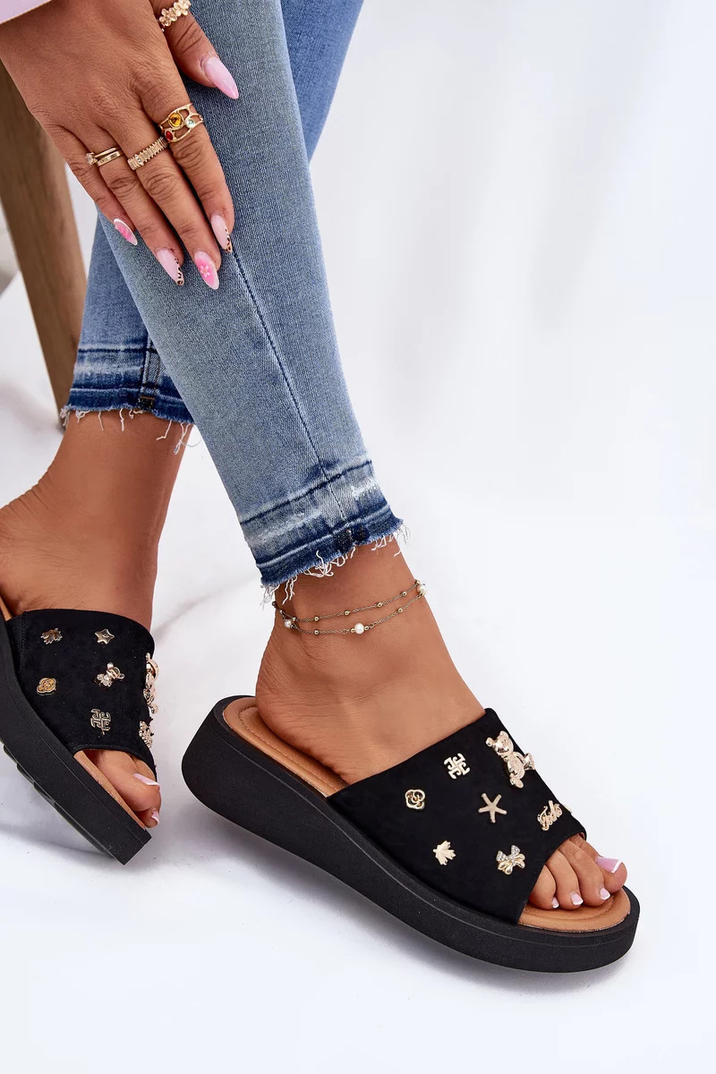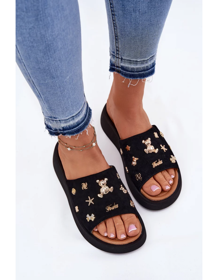 Dámské pantofle Vinceza jsou vyrobené z měkkého semišového materiálu, který působí elegantně a zároveň příjemně na dotek. Ozdobné připínky dodávají pantoflím originální a stylový vzhled. Černé provedení zajišťuje univerzální kombinovatelnost s různými outfity, ať už na doma nebo ven.