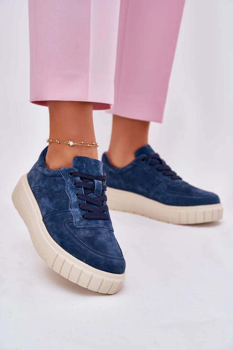 Tmavě modré sneakersy na platformě skvěle doplní outfit v neutrálních barvách, jako je bílá, béžová nebo šedá, a dodají mu elegantní nádech.