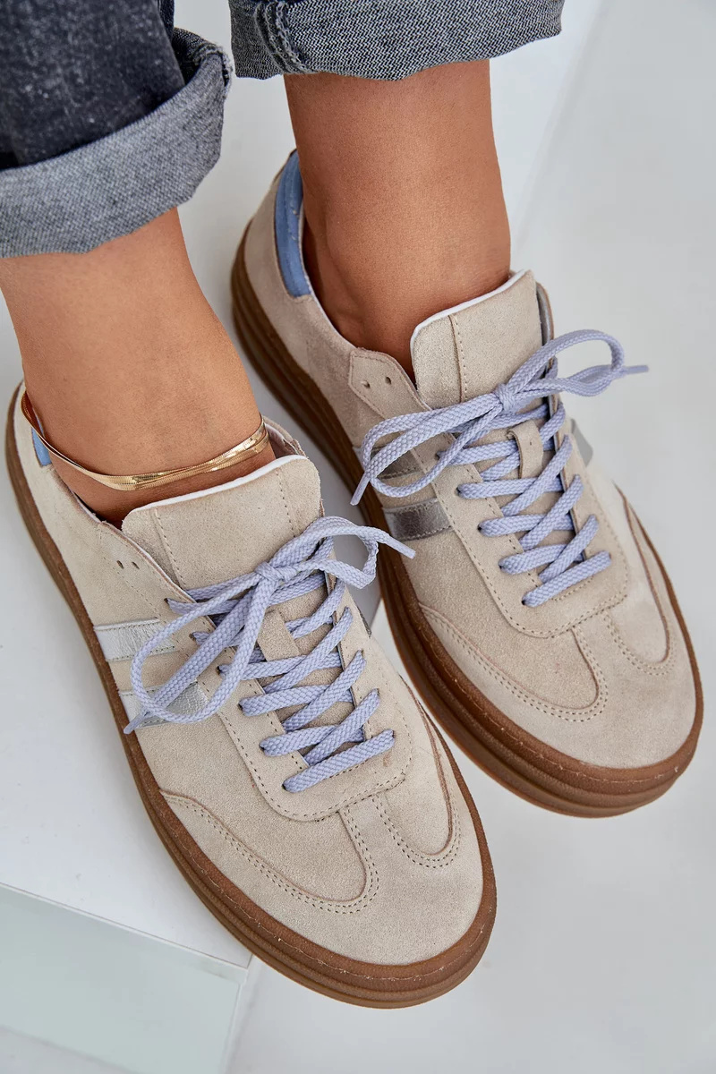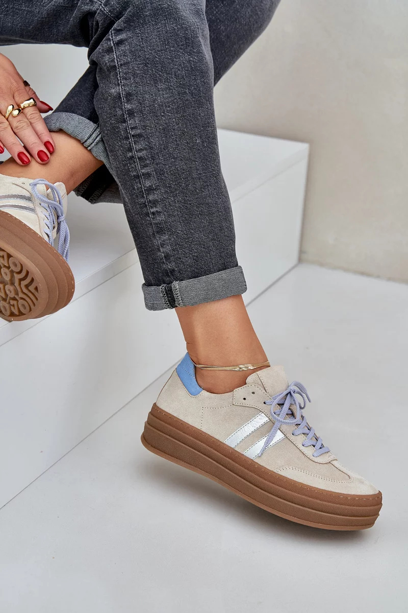 Béžové semišové sneakersy na platformě krásně doplní outfit v přírodních tónech, jako je krémová, hnědá nebo světlá džínovina.
