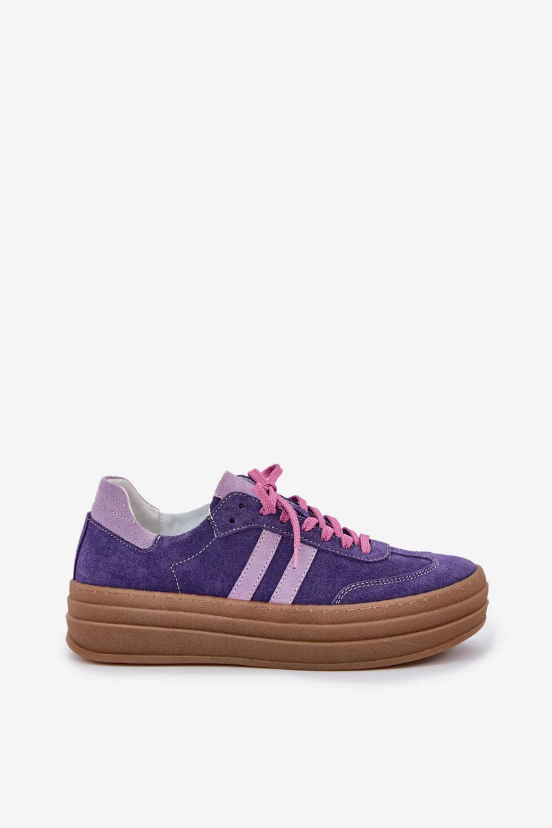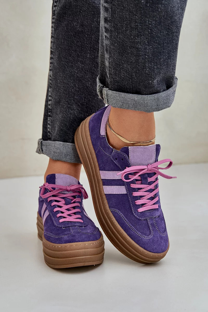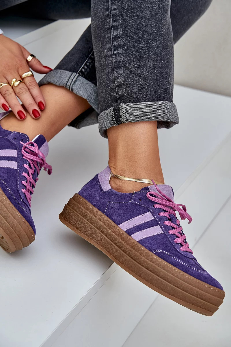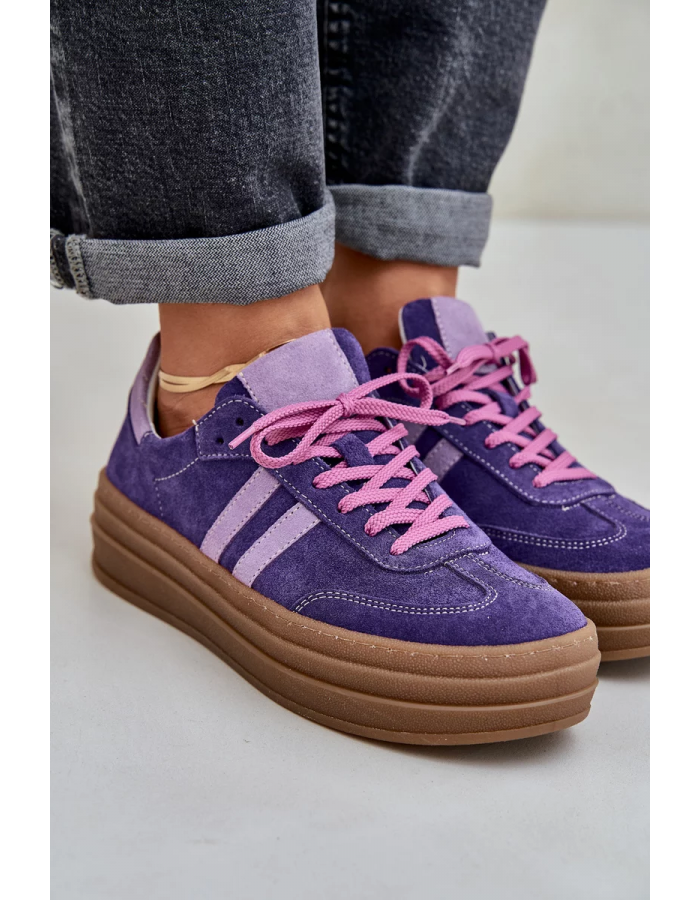 Dámské sneakersy Zazoo v tmavě fialovém provedení zaujmou elegantním semišovým vzhledem a moderní platformovou podešví. Sytý fialový odstín dodává obuvi výrazný, ale stále sofistikovaný charakter, který snadno oživí každodenní outfit. Platforma zajišťuje stabilní došlap a vyšší komfort při chůzi, zatímco kvalitní zpracování podtrhuje celkový prémiový dojem.