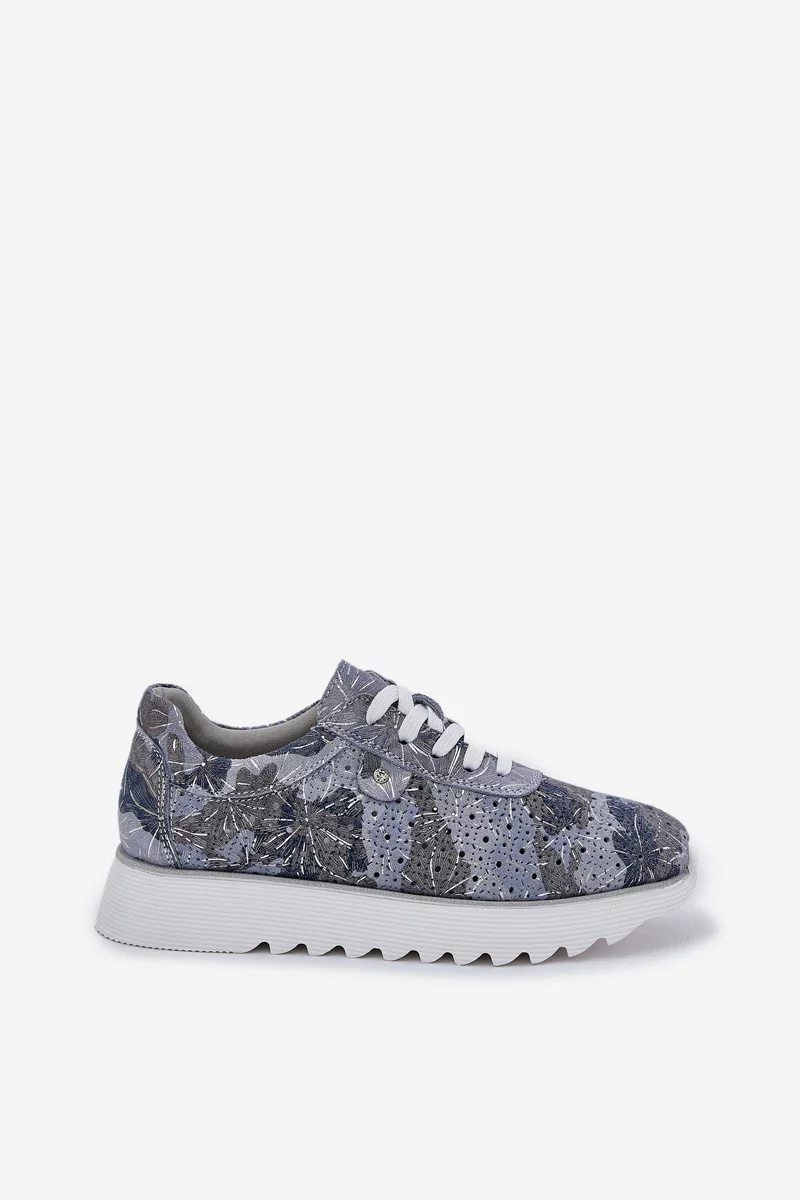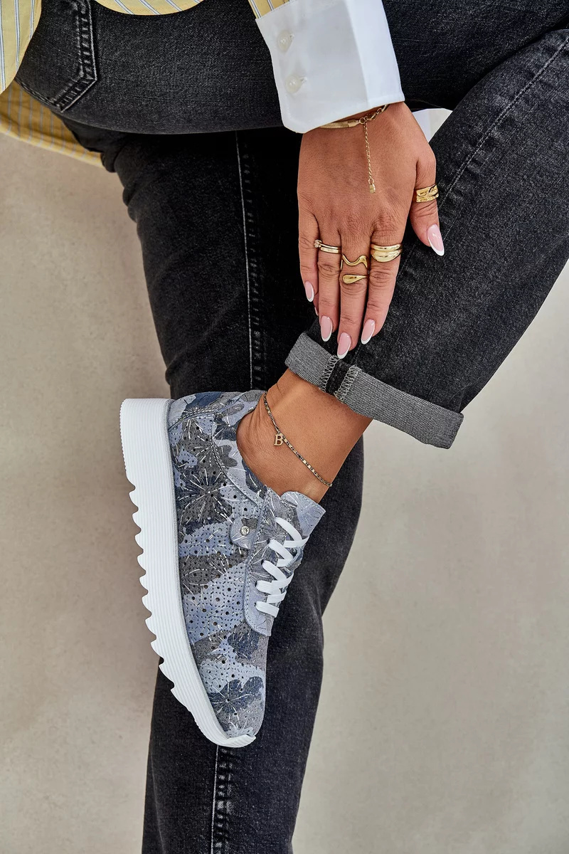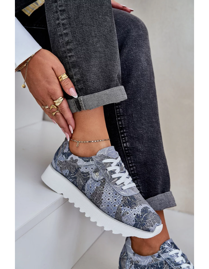 Dámské sportovní boty D&A v modrém provedení zaujmou originálním vzorovaným designem a jemným třpytivým efektem brokátu. Svršek ze semišového materiálu působí stylově a moderně, zatímco platformová podešev dodává obuvi výrazný vzhled a zároveň zvyšuje komfort při chůzi. Model je ideální volbou pro ženy, které chtějí spojit sportovní styl s módním akcentem.
