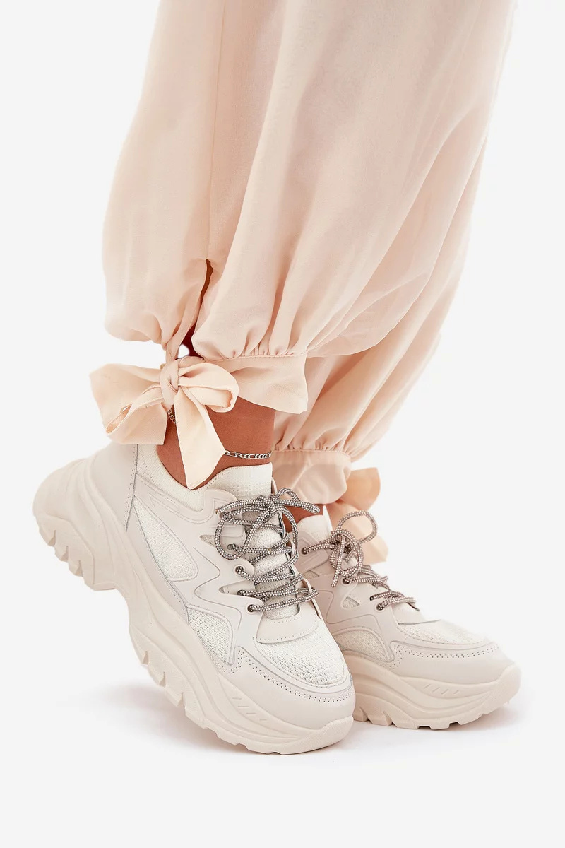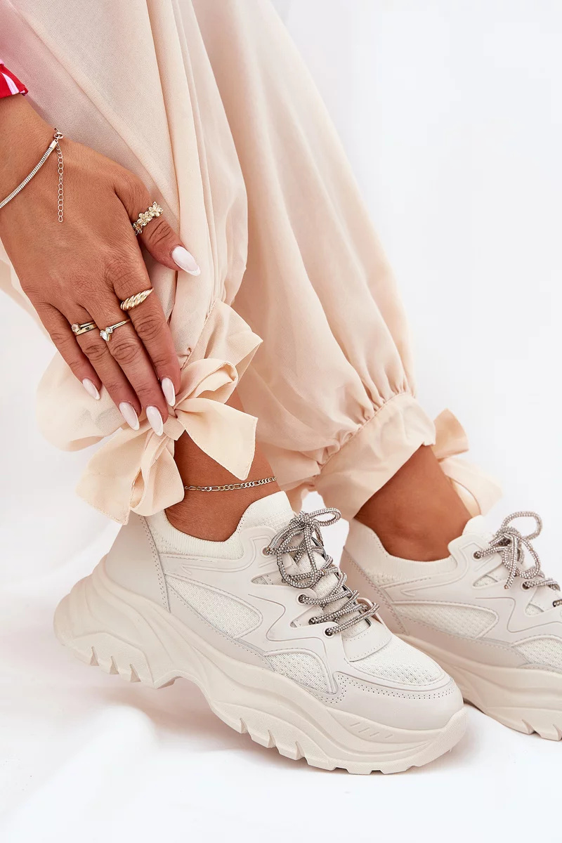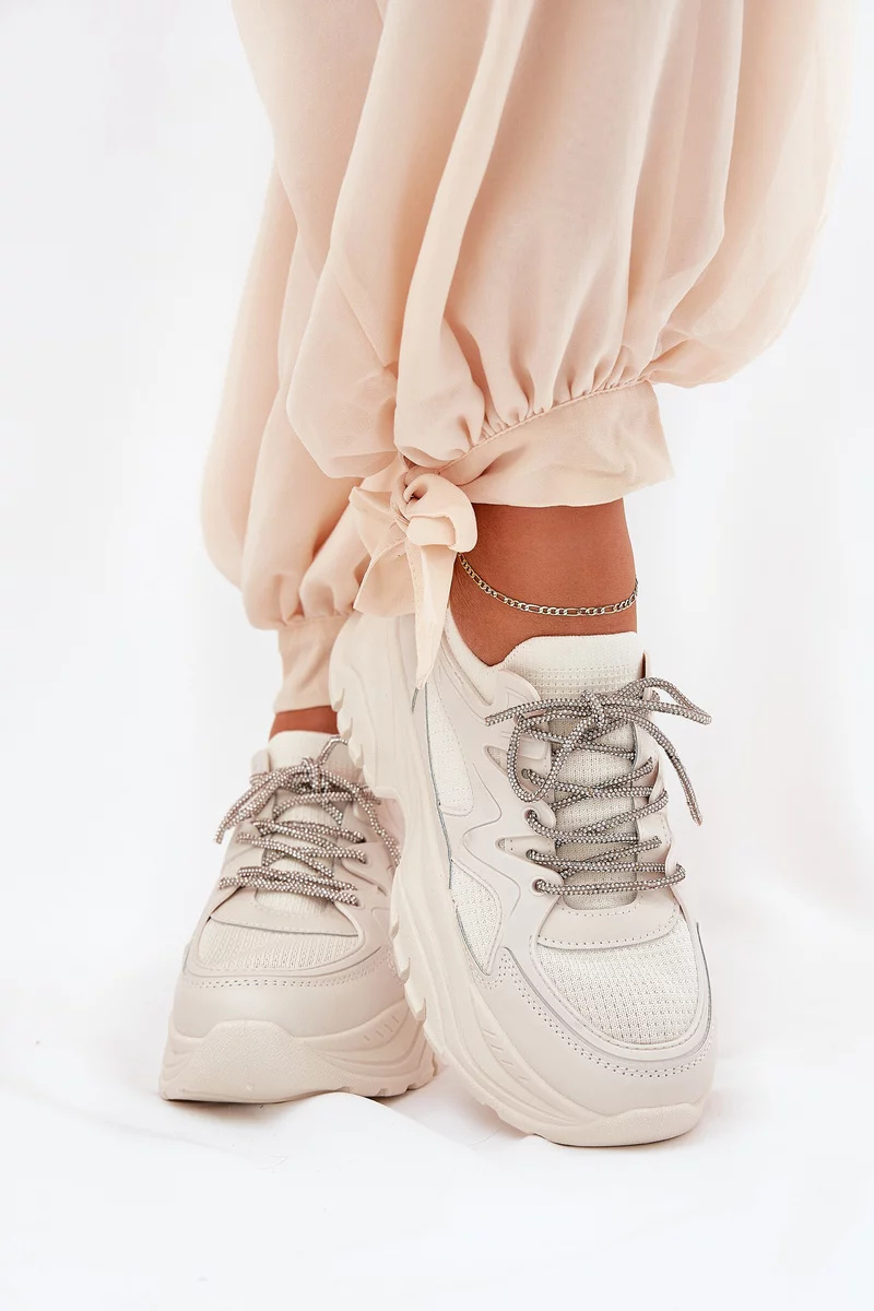 Béžové sneakersy s ozdobným šněrováním krásně doplní jednoduché outfity v neutrálních tónech, kde vynikne jejich elegantní detail.
