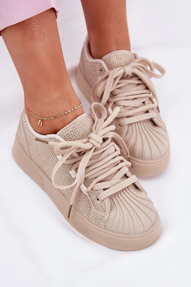 Béžové sneakersy se zdobením krásně doplní jednoduché outfity v neutrálních tónech, kde vyniknou jejich dekorativní prvky.