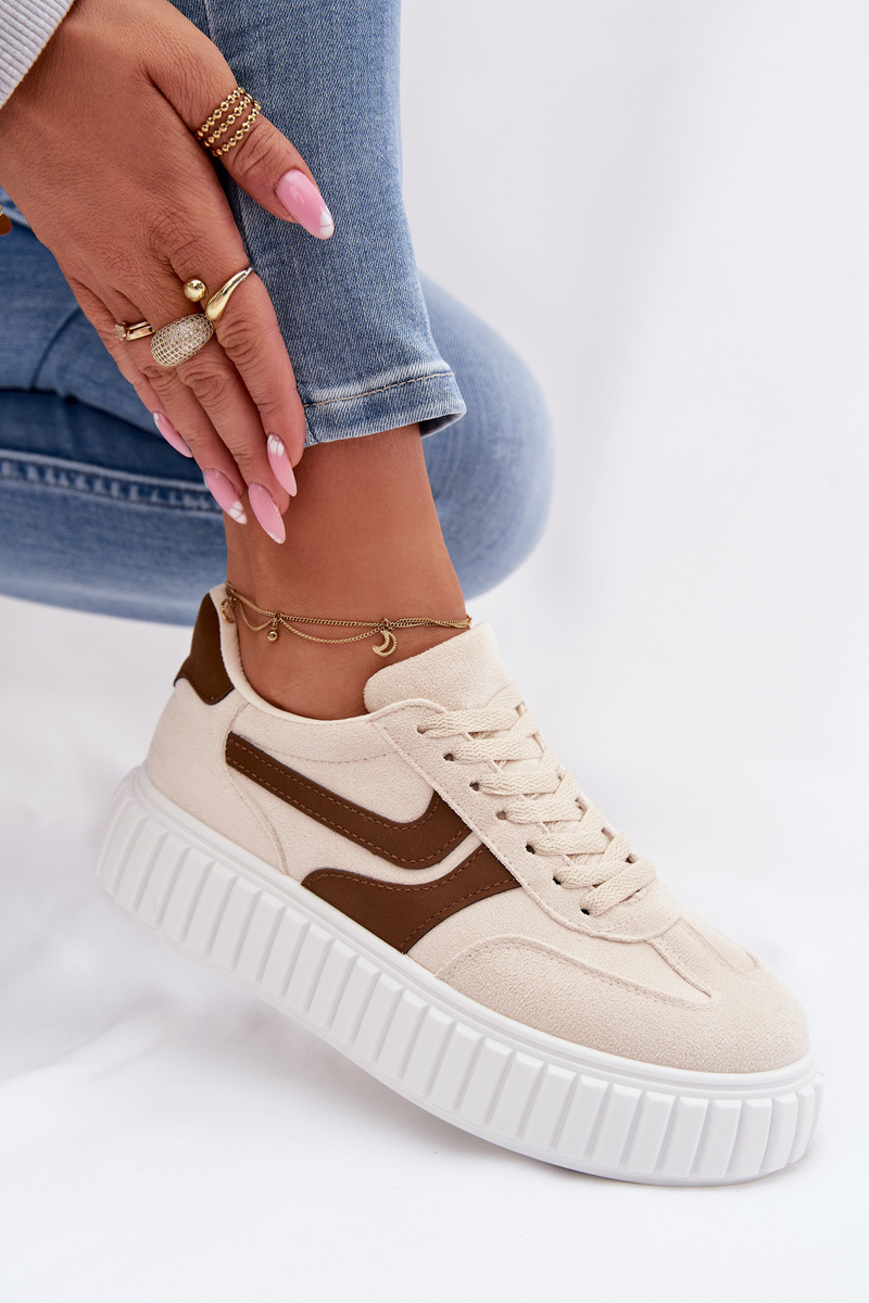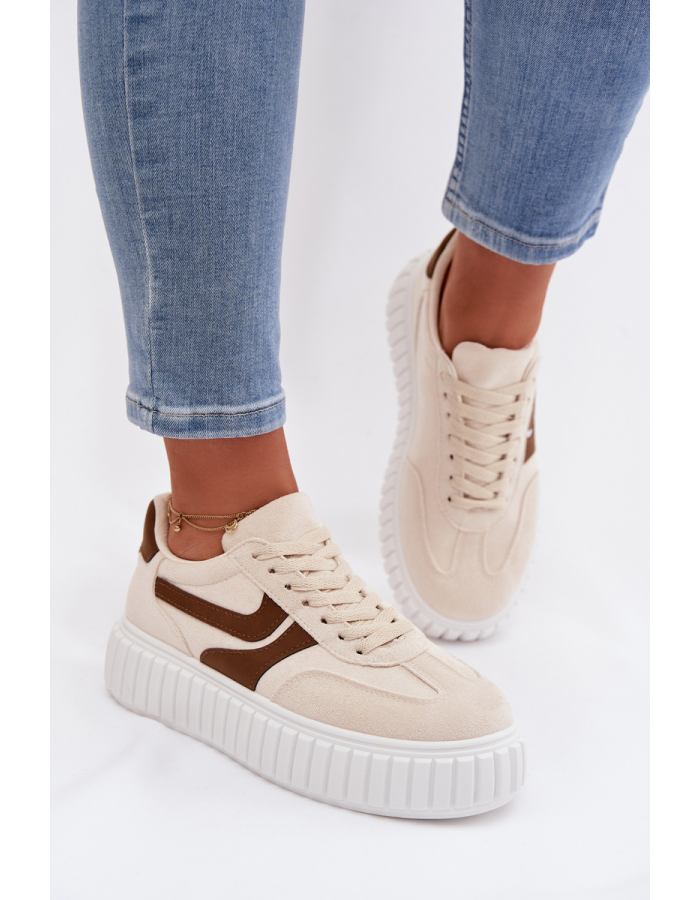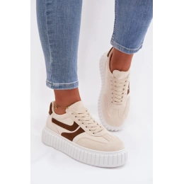 Béžové sneakersy na platformě se skvěle kombinují s džínami, kalhotami i šaty v přírodních a světlých tónech a vytvoří moderní outfit.