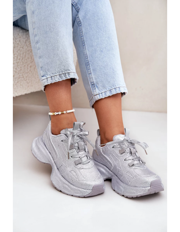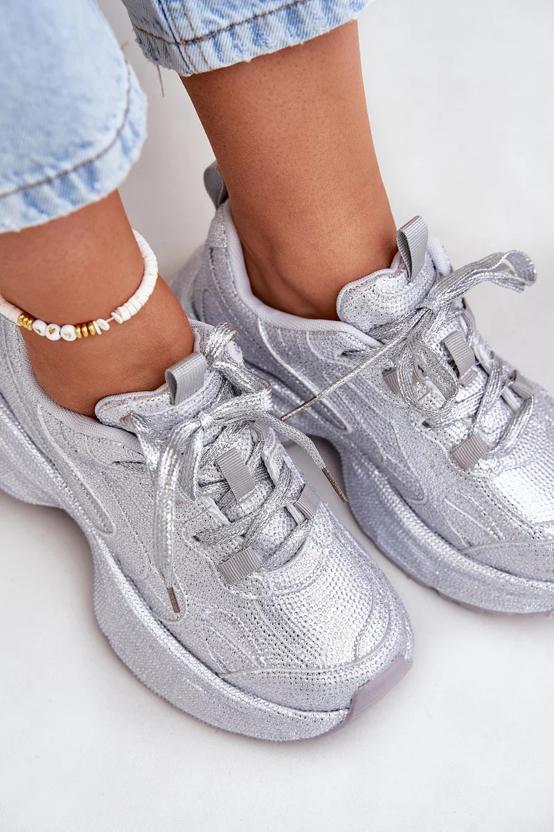Stříbrné sneakersy se zirkony kombinujte s jednoduchými a jednobarevnými outfity, aby vyniklo jejich zdobení a lesk.